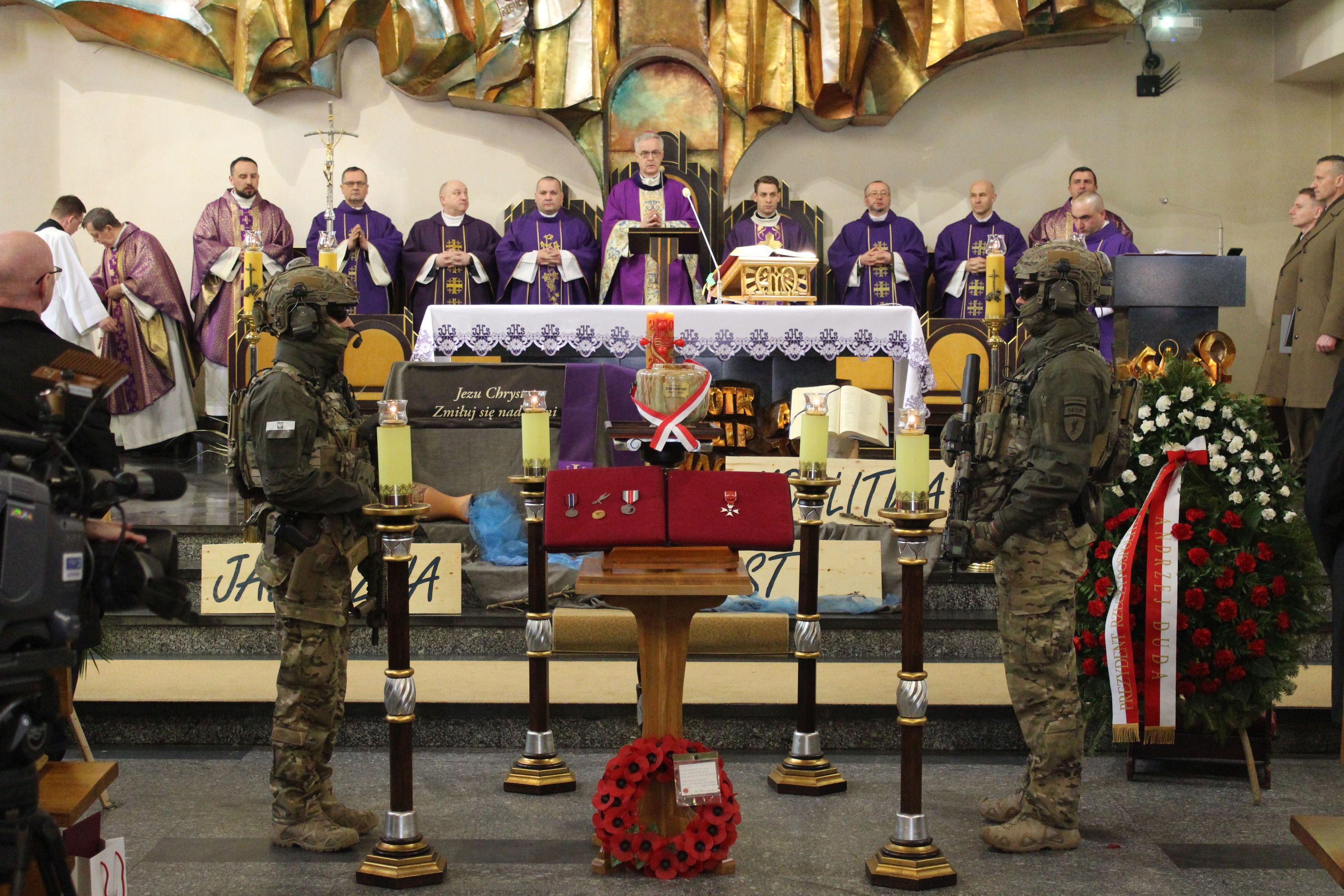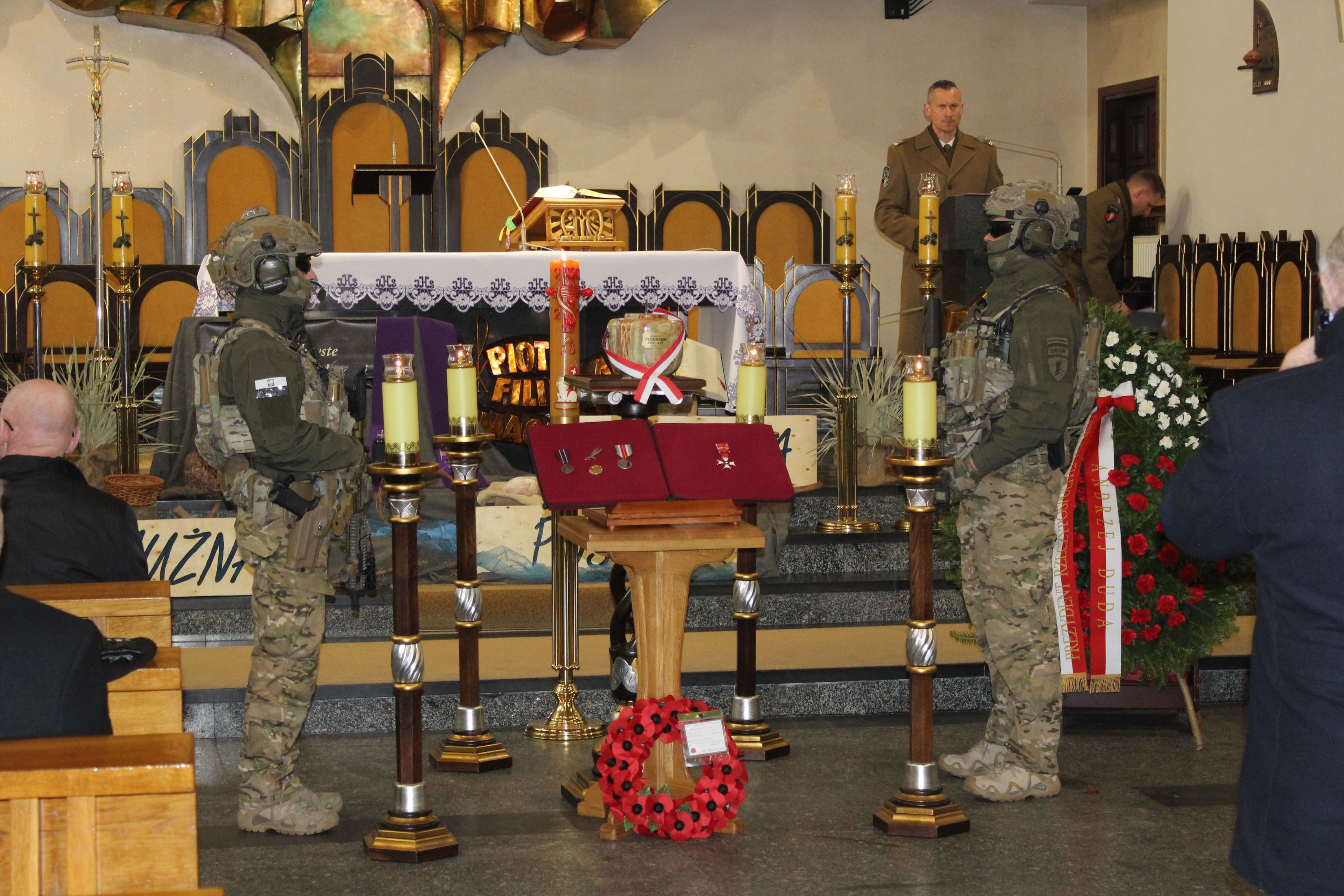 Uroczystościom pogrzebowym, które rozpoczęły się w kościele Najświętszej Marii Panny Królowej Polski w Bielsku-Białej, przewodniczył biskup polowy Wojska Polskiego Wiesław Lechowicz. Obecni byli m.in. członkowie najbliższej rodziny zmarłego, przedstawiciele Kancelarii Prezydenta RP oraz wojska, w tym liczna grupa żołnierzy z jednostki Grom, która nawiązuje do tradycji Cichociemnych. W uroczystości wzięła udział także reprezentacja Instytutu Pamięci Narodowej.