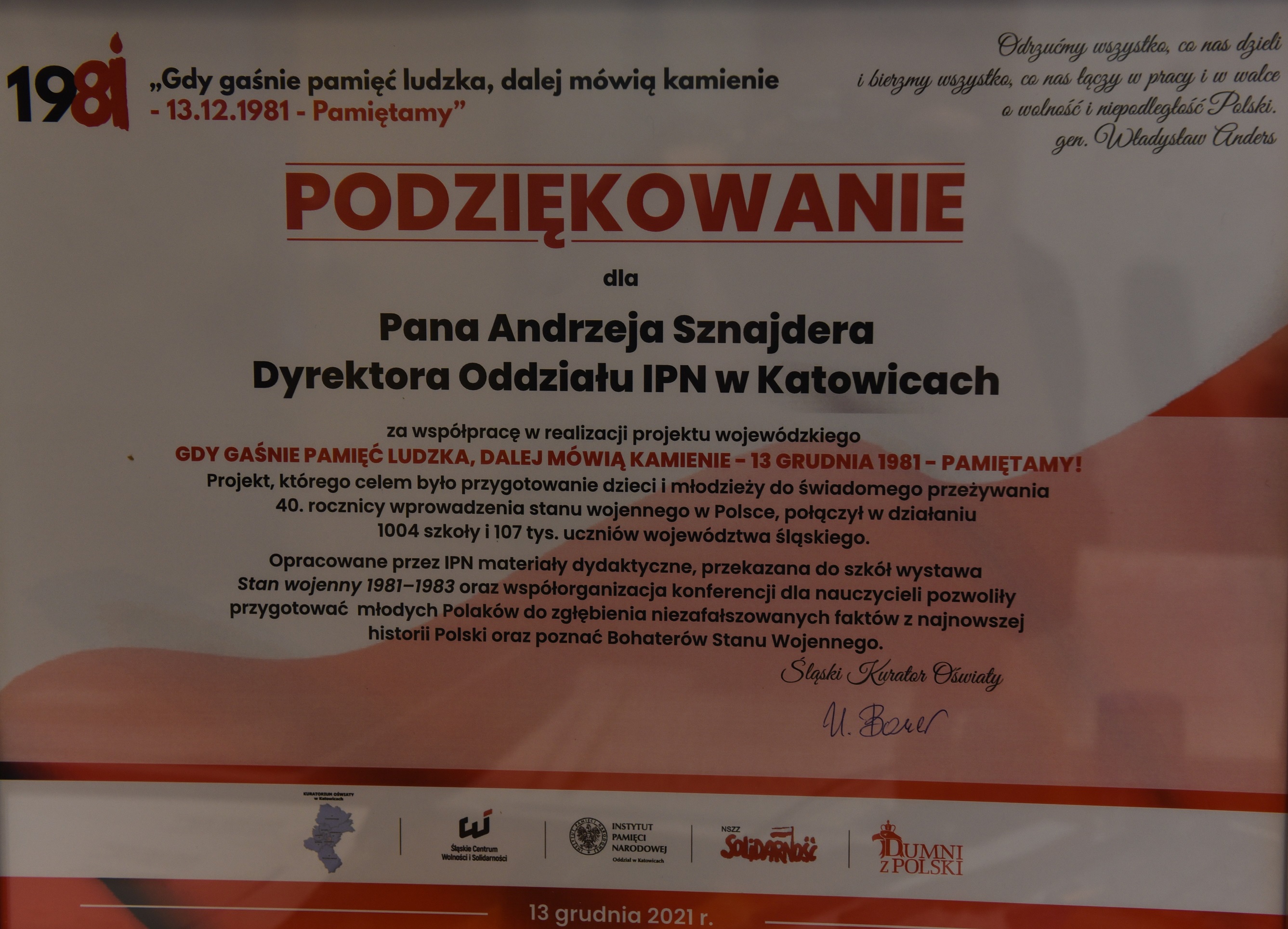 11 marca 2022 r. w Katowicach odbyło się podsumowanie projektu „Gdy gaśnie pamięć ludzka, dalej mówią kamienie – 13 grudnia 1981 – Pamiętamy!“. W uroczystości wzięli udział represjonowani, opozycjoniści z lat osiemdziesiątych, a także przedstawiciele szkół, których uczniowie oraz nauczyciele zostali nagrodzeni bądź wyróżnieni w konkursach organizowanych w ramach projektu. Wręczono podziękowania dla honorowych patronów i partnerów projektu. Urszula Bauer, Śląski Kurator Oświaty podsumowując projekt poinformowała, że wzięło w nim udział ponad 100 tysięcy uczniów. Projekt był realizowany w ponad tysiącu szkół z województwa śląskiego.