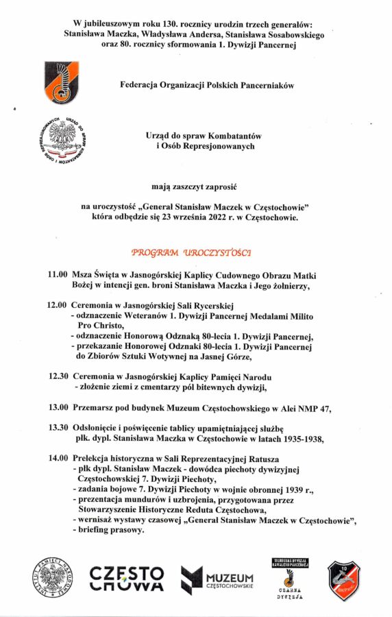 W piątek 23 września 2022 r. w Częstochowie upamiętniono przypadającą w tym roku 130. rocznicę urodzin gen. broni Stanisława Maczka. Uroczystości rozpoczęły się mszą święta w Jasnogórskiej Kaplicy Cudownego Obrazu Matki Bożej. Po mszy nastąpiła ceremonia przekazania ziemi z cmentarzy wojennych 1 Dywizji Pancernej i złożenia ich w Jasnogórskiej Kaplicy Pamięci Narodu. Jednym z głównych punktów programu było odsłonięcie tablicy upamiętniającej służbę ówczesnego płk. dypl. Stanisława Maczka jako dowódcy Piechoty Dywizyjnej 7 Dywizji Piechoty w latach 1935 – 1938, która została umieszczona na budynku dawnego dowództwa 7 Dywizji Piechoty (Al. NMP 47). W programie m.in. konferencja popularnonaukowa poświęcona pułkownikowi i częstochowskiej dywizji, która odbyła się w Sali Reprezentacyjnej Ratusza w Muzeum Częstochowskim. Jednym z głównych prelegentów był Adam Kurus, historyk wojskowości, pracownik Oddziałowego Biura Edukacji Narodowej IPN w Katowicach. W obchodach wziął udział Ryszard Mozgol, naczelnik Oddziałowego Biura Edukacji IPN w Katowicach.