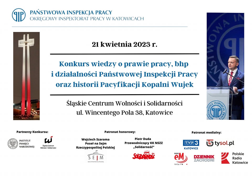Organizatorzy konkursu: Okręgowy Inspektorat Pracy w Katowicach, Śląskie Centrum Wolności i Solidarności, Instytut Pamięci Narodowej w Katowicach.