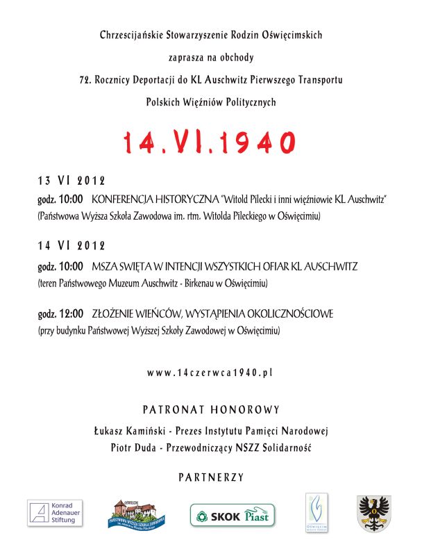 Chrześcijańskie Stowarzyszenie Rodzin Oświęcimskich zorganizowało obchody 72. rocznicy deportacji do KL Auschwitz pierwszego transportu polskich więźniów politycznych 14 czerwca 1940 r. W uroczystości wziął udział dr Andrzej Drogoń, dyrektor oddziału IPN w Katowicach.