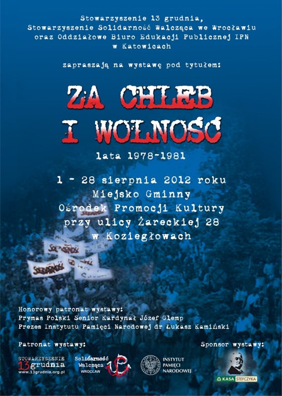 W dniach od 1 do 28 sierpnia 2012 r. w Miejsko-Gminnym Ośrodku Promocji Kultury w Koziegłowach (ul. Żarecka 28) prezentowana będzie wystawa „Za chleb i wolność. Lata 1978–1981”. Ekspozycję wystawy w Myszkowie zorganizował OBEP IPN w Katowicach przy współudziale Miejsko Gminnego Ośrodka Promocji Kultury w Koziegłowach, Stowarzyszenia „13 Grudnia” oraz Stowarzyszenia Solidarność Walcząca z Wrocławia.