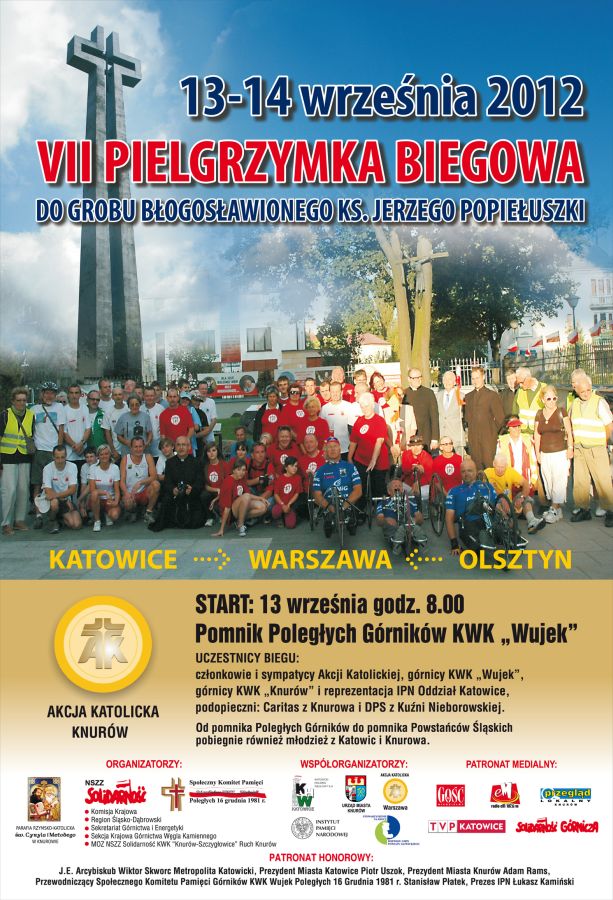 13 września 2012 r. pod pomnikiem Poległych Górników KWK „Wujek” w Katowicach rozpoczęła się VII Pielgrzymka biegowa do grobu bł. ks. Jerzego Popiełuszki. Uczestnicy sztafety biegną w dniach 13–14 września 2012 r. do grobu bł. ks. Jerzego Popiełuszki. VII pielgrzymka biegowa została zorganizowana przez parafię pw. św. Cyryla i Metodego w Knurowie, Społeczny Komitet Pamięci Poległych 16 grudnia 1981 r. oraz NSZZ „Solidarność”, we współpracy z Oddziałem Instytutu Pamięci Narodowej w Katowicach. W biegu biorą udział pracownicy Oddziału IPN w Katowicach. Wydarzenie objął patronatem dr Łukasz Kamiński, Prezes IPN.