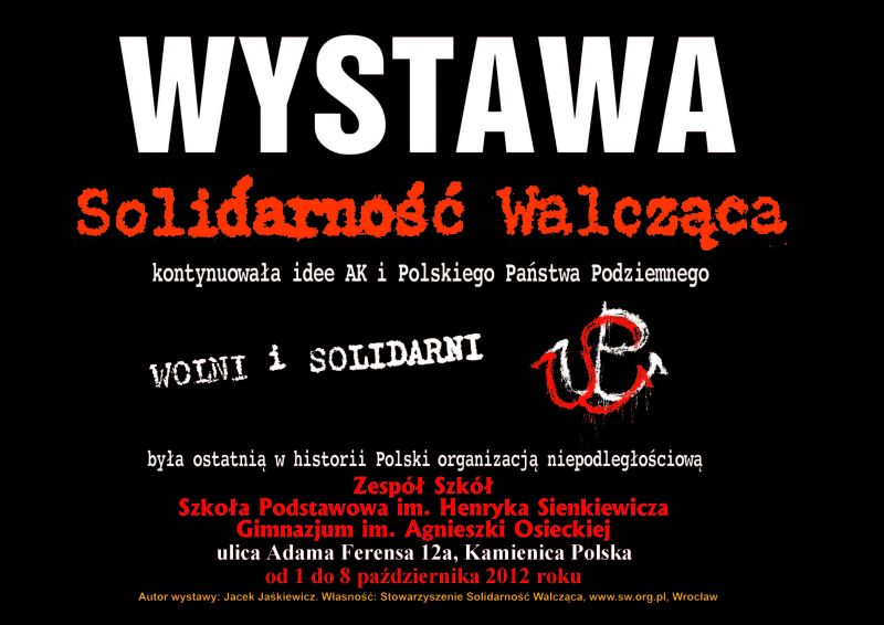 W dniach od 1 do 8 października 2012 r. w Zespole Szkół w Kamienicy Polskiej (ul. Adama Ferensa 12a) prezentowana jest wystawa „Wolni i Solidarni”, przygotowana przez Jacka Jaśkiewicza z wrocławskiego Stowarzyszenia Solidarność Walcząca. Organizatorem prezentacji wystawy jest OBEP IPN w Katowicach we współpracy z Zespołem Szkół w Kamienicy Polskiej i Stowarzyszeniem Solidarność Walcząca we Wrocławiu.