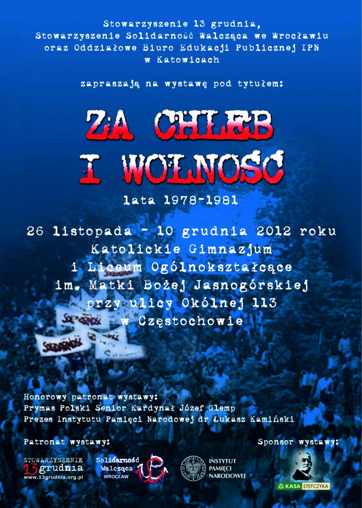 W dniach od 26 listopada do 10 grudnia 2012 r. w Katolickim Gimnazjum i Liceum Ogólnokształcącym im. Matki Bożej Jasnogórskiej w Częstochowie (ul. Okólna 113), prezentowana jest wystawa „Za chleb i wolność. Lata 1978–1981”. Ekspozycję wystawy w Częstochowie zorganizował OBEP IPN w Katowicach przy współudziale Katolickiego Gimnazjum i Liceum Ogólnokształcącego im. Matki Bożej Jasnogórskiej w Częstochowie, Stowarzyszenia „13 Grudnia” oraz Stowarzyszenia Solidarność Walcząca z Wrocławia.