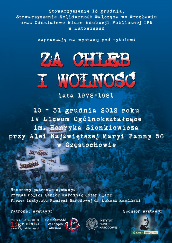 W dniach od 10 do 31 grudnia 2012 r. w IV Liceum Ogólnokształcącym im. Henryka Sienkiewicza w Częstochowie (Aleja Najświętszej Maryi Panny 56), prezentowana jest wystawa „Za chleb i wolność. Lata 1978–1981”. Ekspozycję wystawy w Częstochowie zorganizował OBEP IPN w Katowicach przy współudziale IV Liceum Ogólnokształcącego im. Henryka Sienkiewicza w Częstochowie, Stowarzyszenia „13 Grudnia” oraz Stowarzyszenia Solidarność Walcząca z Wrocławia.