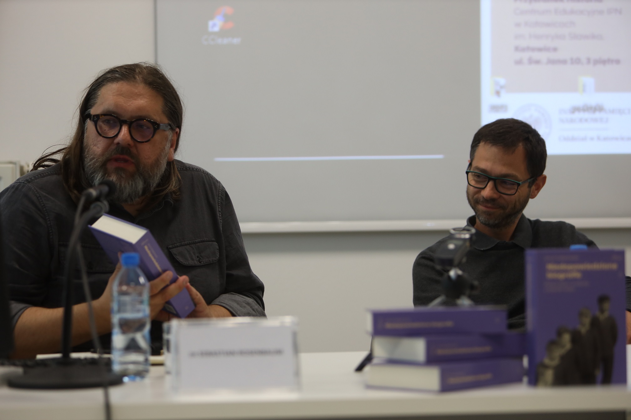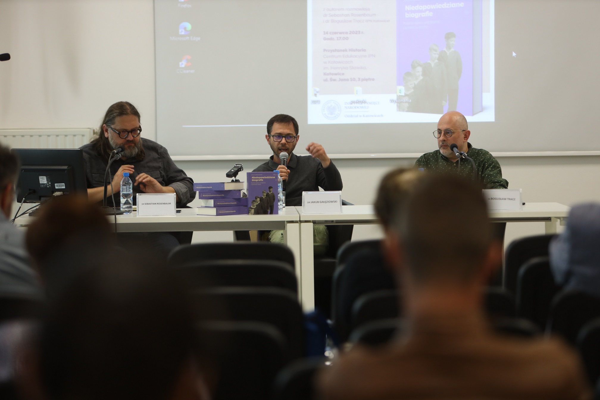 14 czerwca 2023 r. o godz. 17.00 w Przystanku Historia Centrum Edukacyjnym IPN w Katowicach im. Henryka Sławika, ul. św. Jana 10 (III piętro) odbyło się spotkanie z dr. Jakubem Gałęziowskim, historykiem z Uniwersytetu Warszawskiego. Jest on autorem pionierskiej publikacji „Niedopowiedziane biografie. Polskie dzieci urodzone z powodu wojny“. Książka w 2023 r otrzymała nagrodę tygodnika „Polityka” za debiut historyczny roku. Jak czytamy na stronie wydawcy, Krytyki Politycznej, publikacja „dotyczy przede wszystkim dzieci urodzonych z powodu wojny, wojennej przemocy seksualnej, tuż powojennych aborcji i samodzielnego macierzyństwa. Tematy te wciąż są białymi plamami w polskiej historiografii i szerzej – w narracji o II wojnie światowej i jej społecznych konsekwencjach”. Publikacja prezentuje losy zarówno dzieci okupacyjnych, które pozostawił po sobie na ziemiach polskich Wehrmacht – jako efekt gwałtów czy nieformalnych związków – jak i dzieci pozostałych wskutek gwałtów, których dopuszczali się żołnierze Armii Czerwonej na terenach zajmowanych przez nią w końcowej fazie wojny. Jak podkreśla moderujący spotkanie dr Sebastian Rosenbaum (IPN Katowice), „ten temat jest bardzo ważny dla wojennej i tuż powojennej historii Górnego Śląska, gdzie wraz z wkroczeniem Armii Czerwonej na zachodnią część naszego regionu poczynając od stycznia 1945 r. doszło do ogromnej fali gwałtów dokonywanych przez czerwonoarmistów na miejscowych kobietach”. Z kolei uczestnik spotkania, dr Bogusław Tracz (IPN Katowice), zauważa, że „publikacja dr. Gałęziowskiego, choć ma perspektywę ogólnopolską, jest bardzo ważna także dla naszego regionu, ponieważ do tej pory nie podjęto tak dogłębnej i kompleksowej próby opisania zjawiska gwałtów czerwonoarmistów, to wciąż pozostaje tajemnicą poliszynela”.