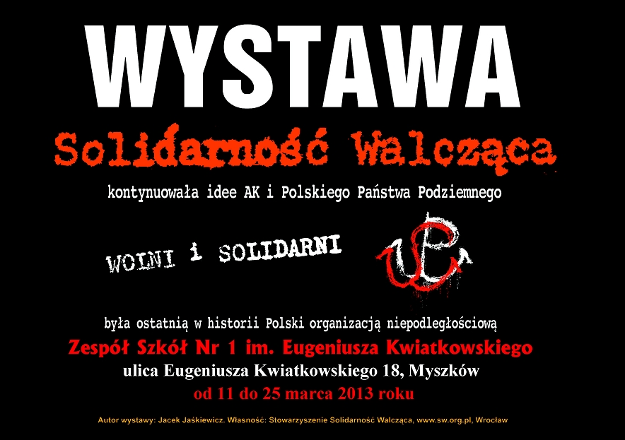 W dniach od 11 do 25 marca 2013 r. w Zespole Szkół Nr 1 im. Eugeniusza Kwiatkowskiego w Myszkowie (ul. Eugeniusza Kwiatkowskiego 18) prezentowana będzie wystawa „Wolni i Solidarni”, przygotowana przez Jacka Jaśkiewicza z wrocławskiego Stowarzyszenia Solidarność Walcząca. Organizatorem prezentacji wystawy jest OBEP IPN w Katowicach we współpracy z  Zespołem Szkół Nr 1 im. Eugeniusza Kwiatkowskiego w Myszkowie  i Stowarzyszeniem Solidarność Walcząca we Wrocławiu.