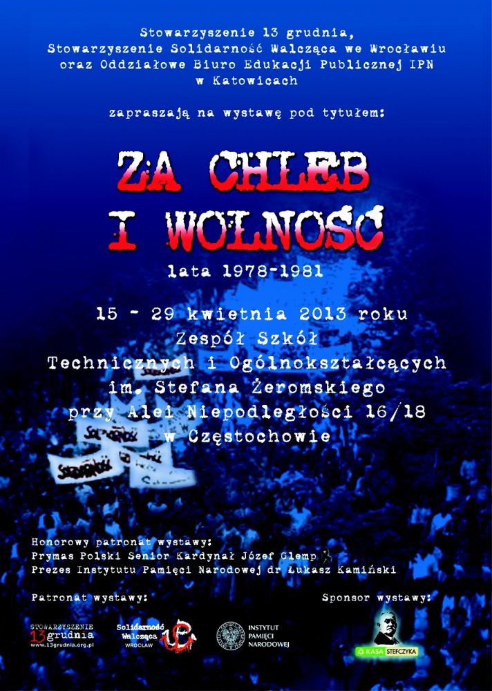 W dniach od 15 do 29 kwietnia 2013 r. w Zespole Szkół Ogólnokształcących i Technicznych im. Stefana Żeromskiego w Częstochowie (Aleja Niepodległości 16/18), prezentowana będzie wystawa „Za chleb i wolność. Lata 1978–1981”. Ekspozycję wystawy w Częstochowie zorganizował OBEP IPN w Katowicach przy współudziale Zespołu Szkół Ogólnokształcących i Technicznych im. Stefana Żeromskiego w Częstochowie, Stowarzyszenia „13 Grudnia” oraz Stowarzyszenia Solidarność Walcząca z Wrocławia.