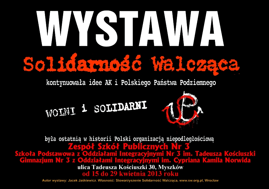 W dniach od 15 do 29 kwietnia 2013 r. w Zespole Szkół Publicznych Nr 3 w Myszkowie – Szkoła Podstawowa z Oddziałami Integracyjnymi Nr 3 im. Tadeusza Kościuszki, Gimnazjum Nr 3 z Oddziałami Integracyjnymi im. Cypriana Kamila Norwida (ul. Tadeusza Kościuszki 30) prezentowana będzie wystawa „Wolni i Solidarni”, przygotowana przez Jacka Jaśkiewicza z wrocławskiego Stowarzyszenia Solidarność Walcząca. Organizatorem prezentacji wystawy jest OBEP IPN w Katowicach we współpracy z Zespołem Szkół Publicznych Nr 3 w Myszkowie i Stowarzyszeniem Solidarność Walcząca we Wrocławiu.