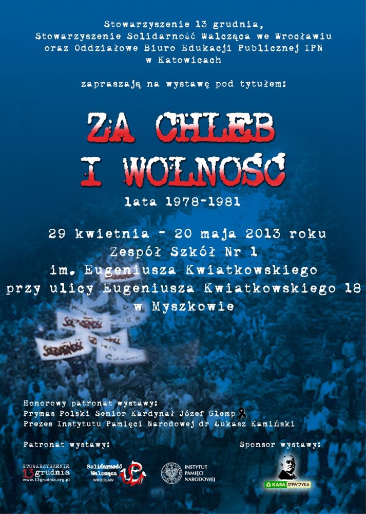 W dniach od 29 kwietnia do 20 maja 2013 r. w Zespole Szkół Nr 1 im. Eugeniusza Kwiatkowskiego w Myszkowie (ulica Eugeniusza Kwiatkowskiego 18), prezentowana będzie wystawa „Za chleb i wolność. Lata 1978–1981”. Ekspozycję wystawy w Częstochowie zorganizował OBEP IPN w Katowicach przy współudziale Zespołu Szkół Nr 1 im. Eugeniusza Kwiatkowskiego w Myszkowie, Stowarzyszenia „13 Grudnia” oraz Stowarzyszenia Solidarność Walcząca z Wrocławia.