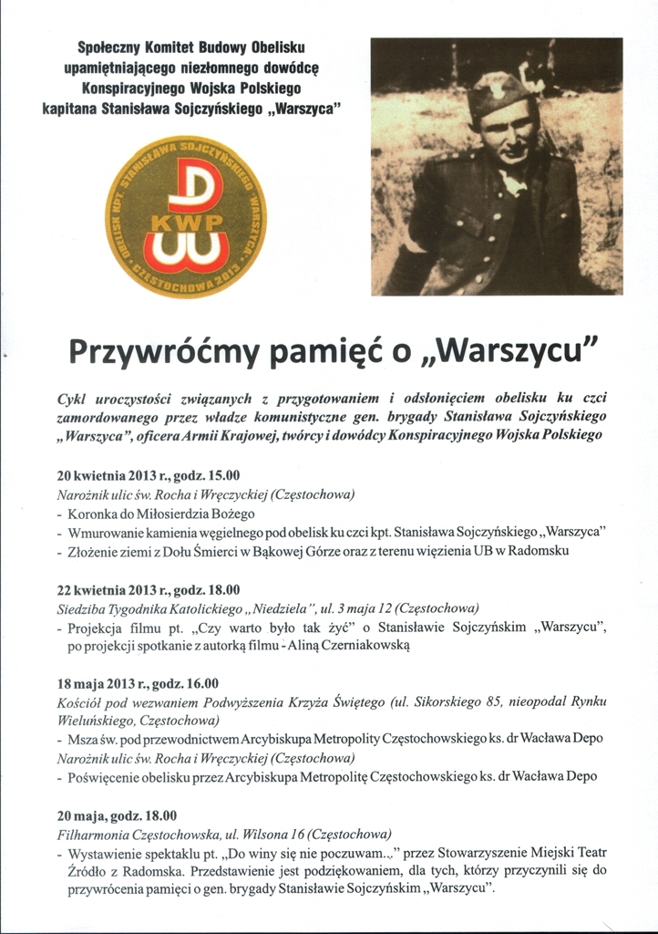 Społeczny Komitet Budowy Obelisku upamiętniającego niezłomnego dowódcę Konspiracyjnego Wojska Polskiego kpt. Stanisława Sojczyńskiego „Warszyca" zorganizował uroczystości związane z przygotowaniem i odsłonięciem obelisku ku czci zamordowanego przez władze komunistyczne gen. brygady Stanisława Sojczyńskiego „Warszyca", oficera Armii Krajowej, twórcy i dowódcy Konspiracyjnego Wojska Polskiego. Honorowy patronat nad uroczystościami sprawują: arcybiskup Metropolita Częstochowski ks. dr Wacław Depo oraz dyrektor oddziału katowickiego IPN dr Andrzej Drogoń. Pomnik odsłonięto 18 maja 2013 r.