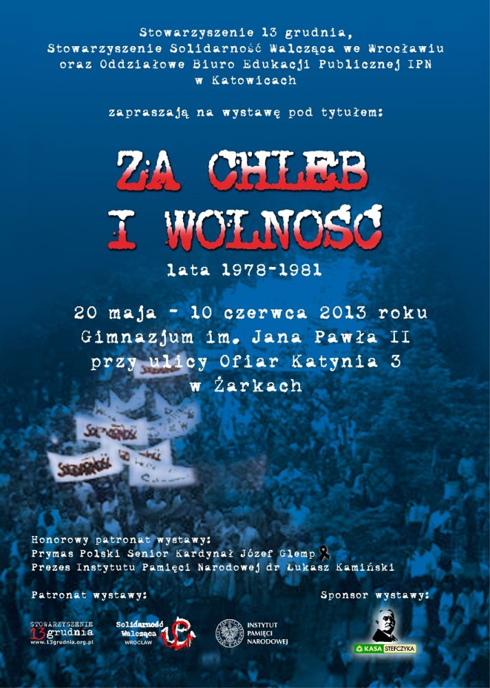 W dniach od 20 maja do 10 czerwca 2013 r. w Gimnazjum im. Jana Pawła II (ul. Ofiar Katynia 3), prezentowana będzie wystawa „Za chleb i wolność. Lata 1978–1981”. Ekspozycję wystawy w Żarkach zorganizował OBEP IPN w Katowicach przy współudziale Gimnazjum im. Jana Pawła II (ul. Ofiar Katynia 3), Stowarzyszenia „13 Grudnia” oraz Stowarzyszenia Solidarność Walcząca z Wrocławia.