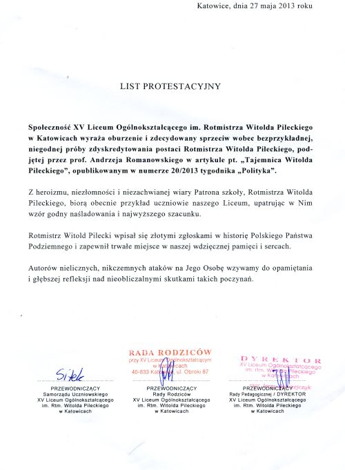 Poniżej publikujemy list społeczności XV Liceum Ogólnokształcącego im. Rotmistrza Pileckiego w Katowicach dotyczący sprzeciwu wobec artykułu autorstwa prof. Andrzeja Romanowskiego pt. „Tajemnica Witolda Pileckiego”, opublikowanego na łamach „Polityki” (nr 20/2013).