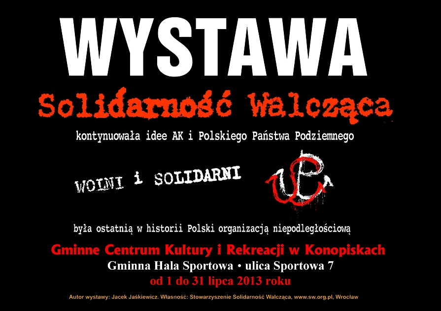 W dniach od 1 do 31 lipca 2013 r. w Gminnym Centrum Kultury i Rekreacji w Konopiskach (Gminna Hala Sportowa, ul. Sportowa 7) prezentowana jest wystawa „Wolni i Solidarni”, przygotowana przez Jacka Jaśkiewicza z wrocławskiego Stowarzyszenia Solidarność Walcząca. Organizatorem prezentacji wystawy jest OBEP IPN w Katowicach we współpracy z Gminnym Centrum Kultury i Rekreacji w Konopiskach oraz Stowarzyszeniem Solidarność Walcząca we Wrocławiu.