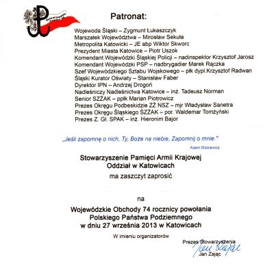 27 września 2013 r. w Katowicach odbędą się obchody 74. rocznicy powołania Polskiego Państwa Podziemnego. Organizatorem uroczystości jest Stowarzyszenie Pamięci Armii Krajowej – Oddział w Katowicach. Uroczystość odbywa się pod patronatem Oddziału Instytutu Pamięci Narodowej w Katowicach.