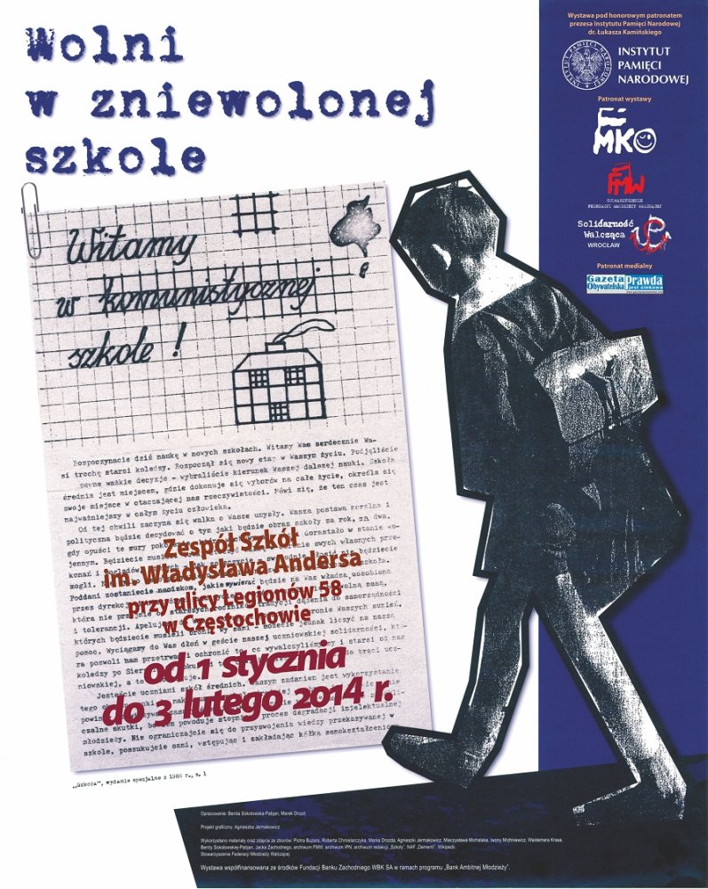 W dniach od 1 stycznia do 3 lutego 2014 r. w Zespole Szkół im. Władysława Andersa w Częstochowie (ul. Legionów 58) prezentowana jest wystawa „Wolni w zniewolonej szkole". Organizatorem prezentacji wystawy jest OBEP IPN w Katowicach we współpracy z Zespołem Szkół im. Władysława Andersa w Częstochowie, Stowarzyszeniem Solidarność Walcząca we Wrocławiu oraz Stowarzyszeniem Federacji Młodzieży Walczącej.