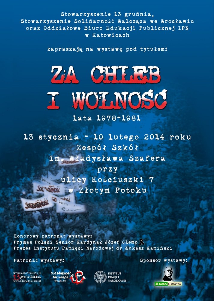 W dniach od 13 stycznia do 10 lutego 2013 r. w Zespole Szkół im. Władysława Szafera w Złotym Potoku (ul. Kościuszki 7), prezentowana jest wystawa „Za chleb i wolność. Lata 1978–1981". Ekspozycję wystawy zorganizował OBEP IPN w Katowicach przy współudziale Zespołu Szkół im. Władysława Szafera w Złotym Potoku, Stowarzyszenia „13 Grudnia" oraz Stowarzyszenia Solidarność Walcząca z Wrocławia.