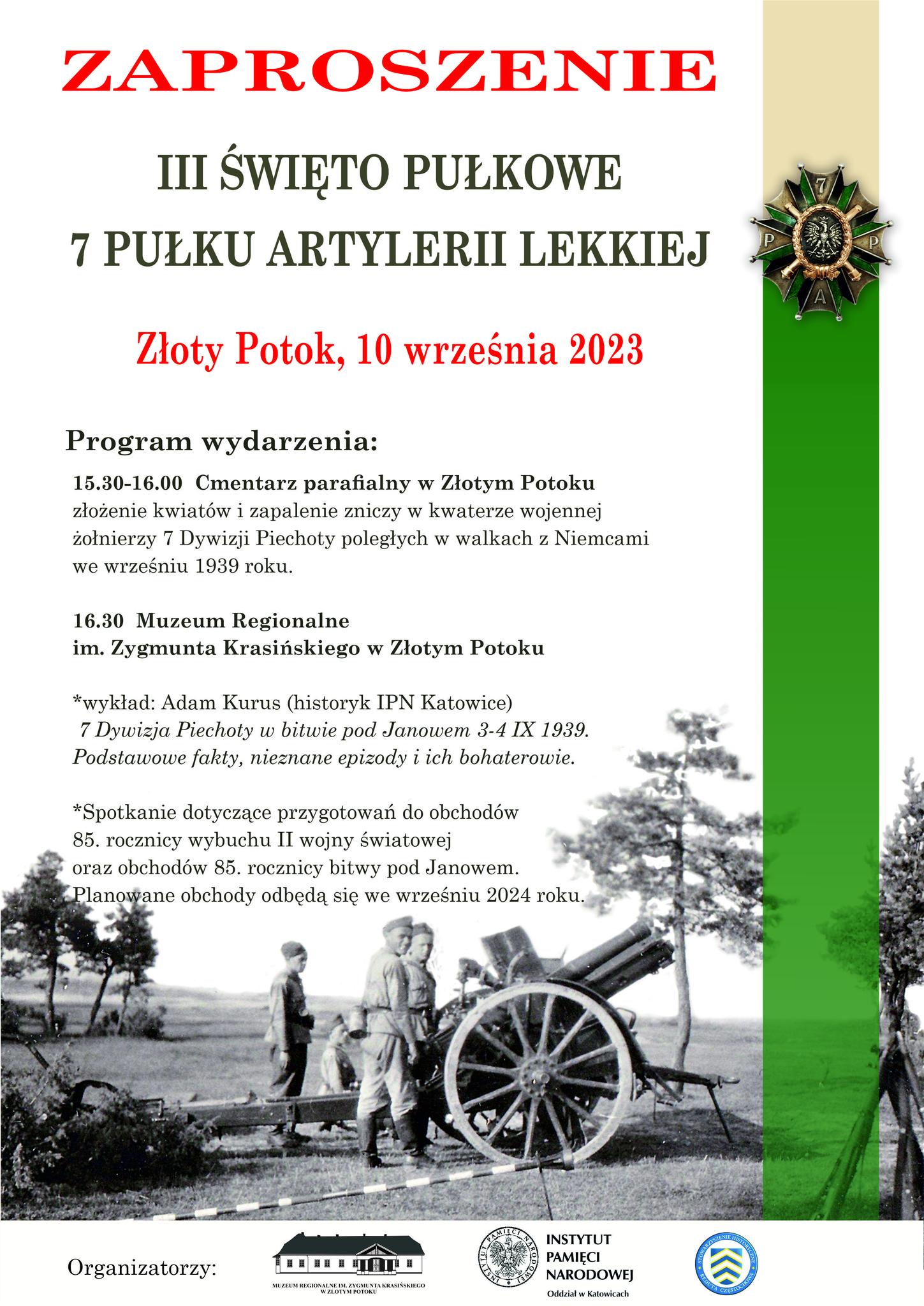 W niedzielę 10 września 2023 roku w Złotym Potoku w Gminie Janów odbyły się obchody III Święta Pułkowego 7 Pułku Artylerii Lekkiej. Wydarzenie zostało zorganizowane przez: Muzeum Regionalne im. Zygmunta Krasińskiego w Złotym Potoku, Oddział Instytutu Pamięci Narodowej w Katowicach oraz Stowarzyszenie Historyczne Reduta Częstochowa.