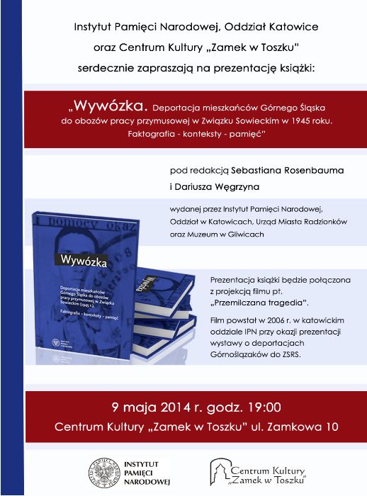 9 maja 2014 r., o godz. 19.00, w Centrum Kultury „Zamek w Toszku" (Toszek, ul. Zamkowa 10) odbędzie się spotkanie z redaktorami książki „Wywózka. Deportacja mieszkańców Górnego Śląska do obozów pracy przymusowej w Związku Sowieckim w 1945 r. Faktografia – konteksty – pamięć" – Sebastianem Rosenbaumem i dr. Dariuszem Węgrzynem z Oddziału IPN w Katowicach. Prezentacja publikacji będzie połączona z projekcją filmu dokumentalnego „Przemilczana tragedia".