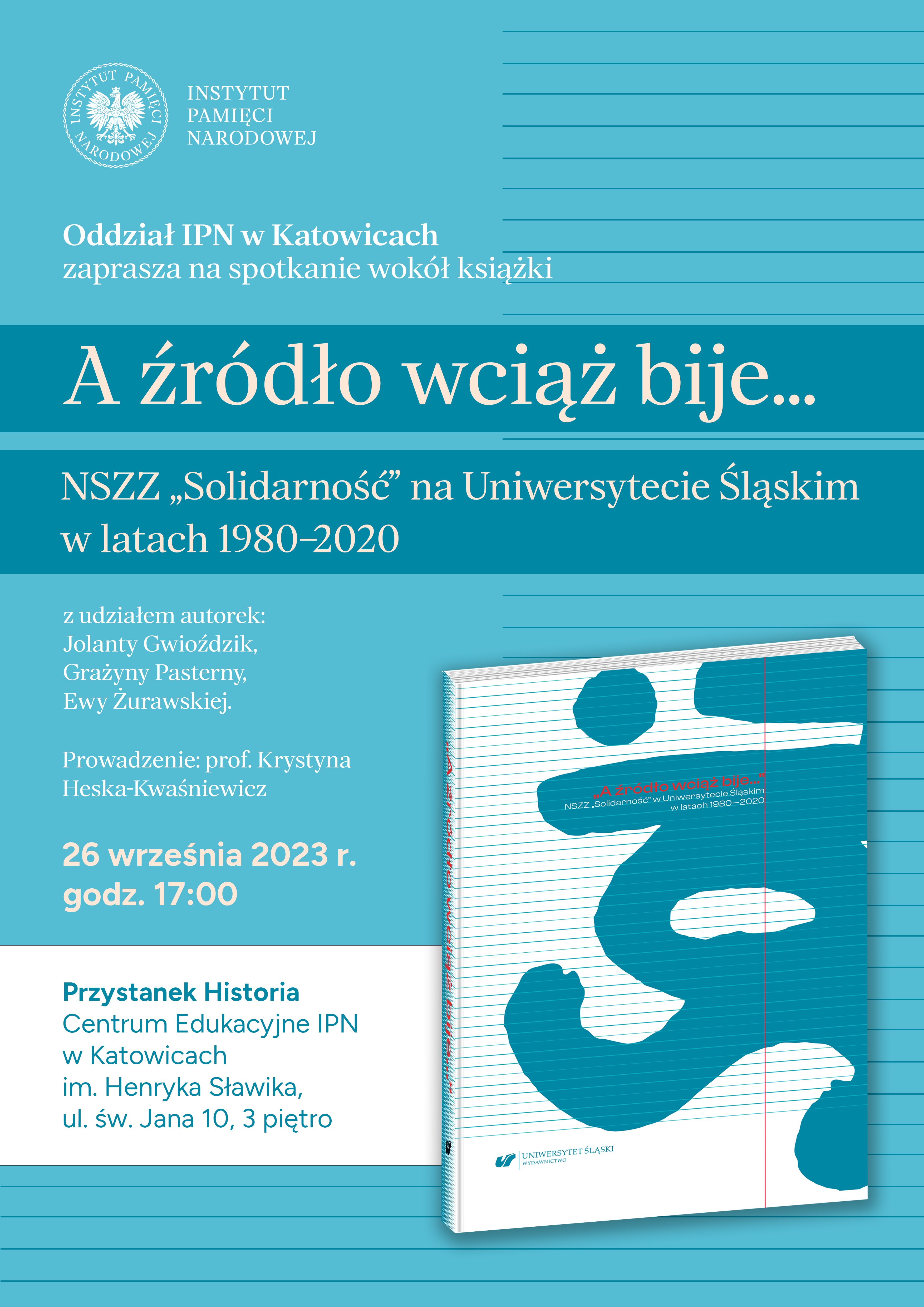 26 września 2023 r. w Przystanku Historia Centrum Edukacyjnym IPN w Katowicach im. Henryka Sławika, przy ul. św. Jana 10, odbyła się promocja książki „»A źródło wciąż bije…«”. NSZZ »Solidarność« na Uniwersytecie Śląskim w l. 1980-2020“. W spotkaniu wzięły udział autorki książki: dr hab. Jolanta Gwioździk, dr Grażyna Pasterna i Ewa Żurawska. Prowadzenie: prof. Krystyna Heska-Kwaśniewicz.