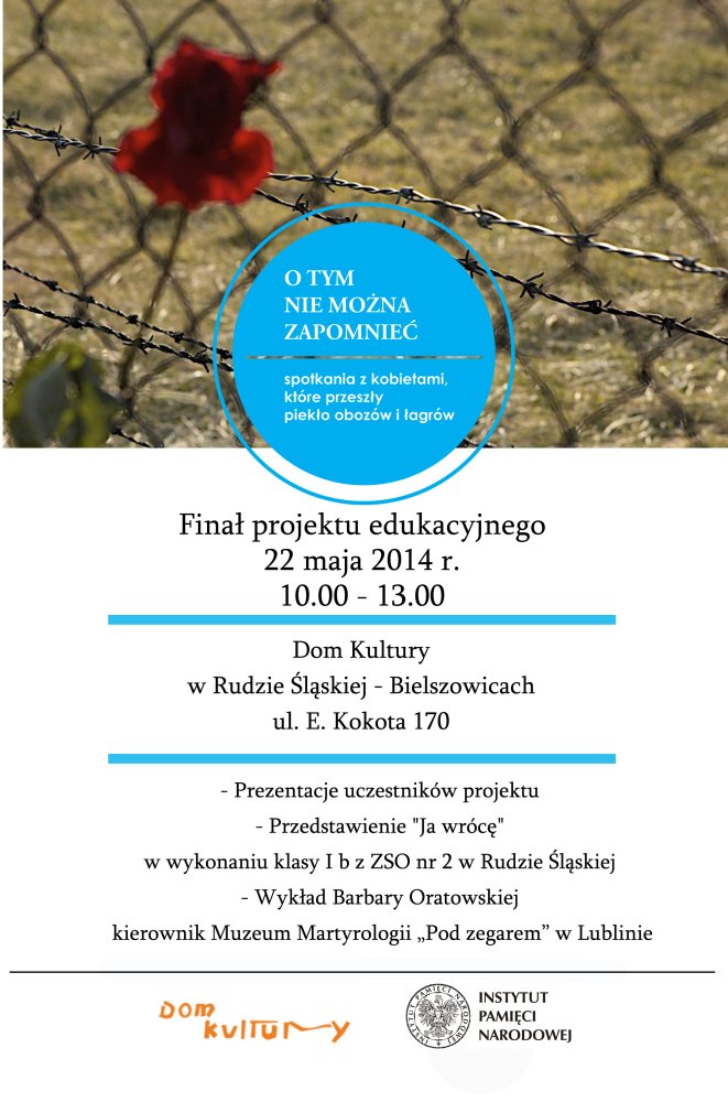 22 maja 2014 r. w Domu Kultury w Rudzie Śląskiej-Bielszowicach odbyła się uroczysta gala finałowa ogólnopolskiego edukacyjnego „O tym nie można zapomnieć – spotkania z kobietami, które przeszły piekło obozów i łagrów".