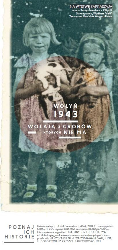 Dziesięcioletnia Stefcia, ośmioletnia Stasia, Witek – dwunastolatek... Strach, ból fizyczny, dramat osierocenia, bezdomność... Historię dwanaściorga dzieci ocalonych z ludobójstwa, ich bliskich i przyjaciół we wspomnieniach opowiedzianych po 70 latach przedstawia pierwsza plenerowa wystawa poświęcona ludobójstwu na Kresach II Rzeczpospolitej „Wołyń 1943. Wołają z grobów, których nie ma". Wstrząsające relacje świadków przywołują dramat dwóch okupacji, narastającą grozę wojenną, a w końcu ludobójcze działania ukraińskich nacjonalistów, w których mordowano całe rodziny, wsie, kolonie... Chór z Ostrówek, szkoła powszechna w Zagajach to tylko wybrane przykłady skupisk ludzkich unicestwionych niemal w całości, które przedstawiono na wielkoformatowych fotografiach. Niejednokrotnie to jedyne ocalone pamiątki rodzinne.