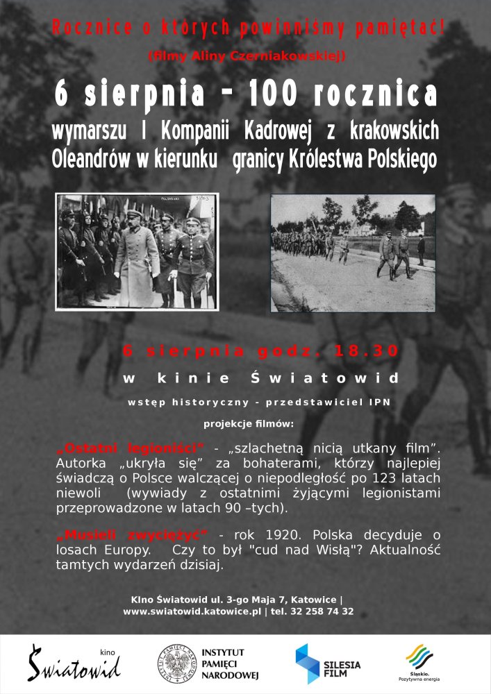 6 sierpnia 2014 r., o godz. 18.30, w kinie Światowid w Katowicach (ul 3 Maja 7) odbędzie się pokaz filmów Aliny Czerniakowskiej w 100. rocznicę wymarszu I Kompanii Kadrowej z krakowskich Oleandrów w kierunku granicy Królestwa Polskiego, poprzedzony prelekcją Sławomira Maślikowskiego (OBEP Katowice).