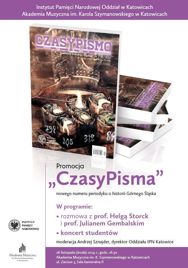 26 listopada 2014 r. w sali kameralnej Akademii Muzycznej w Katowicach odbyło się niezwykłe spotkanie. Przy okazji promocji najnowszego numeru „CzasyPismo" nr 1(5)/2014, półrocznika IPN o historii Górnego Śląska, Andrzej Sznajder, dyrektor katowickiego oddziału IPN gościł dwoje wybitnych muzyków – profesor Helgę Storck i profesora Juliana Gembalskiego. W rozmowie z prof. J. Gembalskim wzięła udział dr Anna Badura (IPN Katowice). Spotkaniu towarzyszył koncert w wykonaniu studentów.