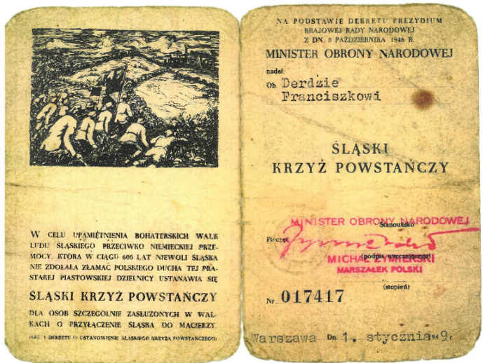 Franciszek Derda urodził się 30 marca 1903 r. Był synem Franciszka i Józefy. W latach 1919-1921 brał czynny udział w trzech powstaniach śląskich. Służył w 3 kompanii 1 baonu 8 pułku tarnogórskiego. Został odznaczony Krzyżem na Śląskiej Wstędze Waleczności i Zasługi oraz Śląskim Krzyżem Powstańczym. Zmarł 20 czerwca 1968 r.