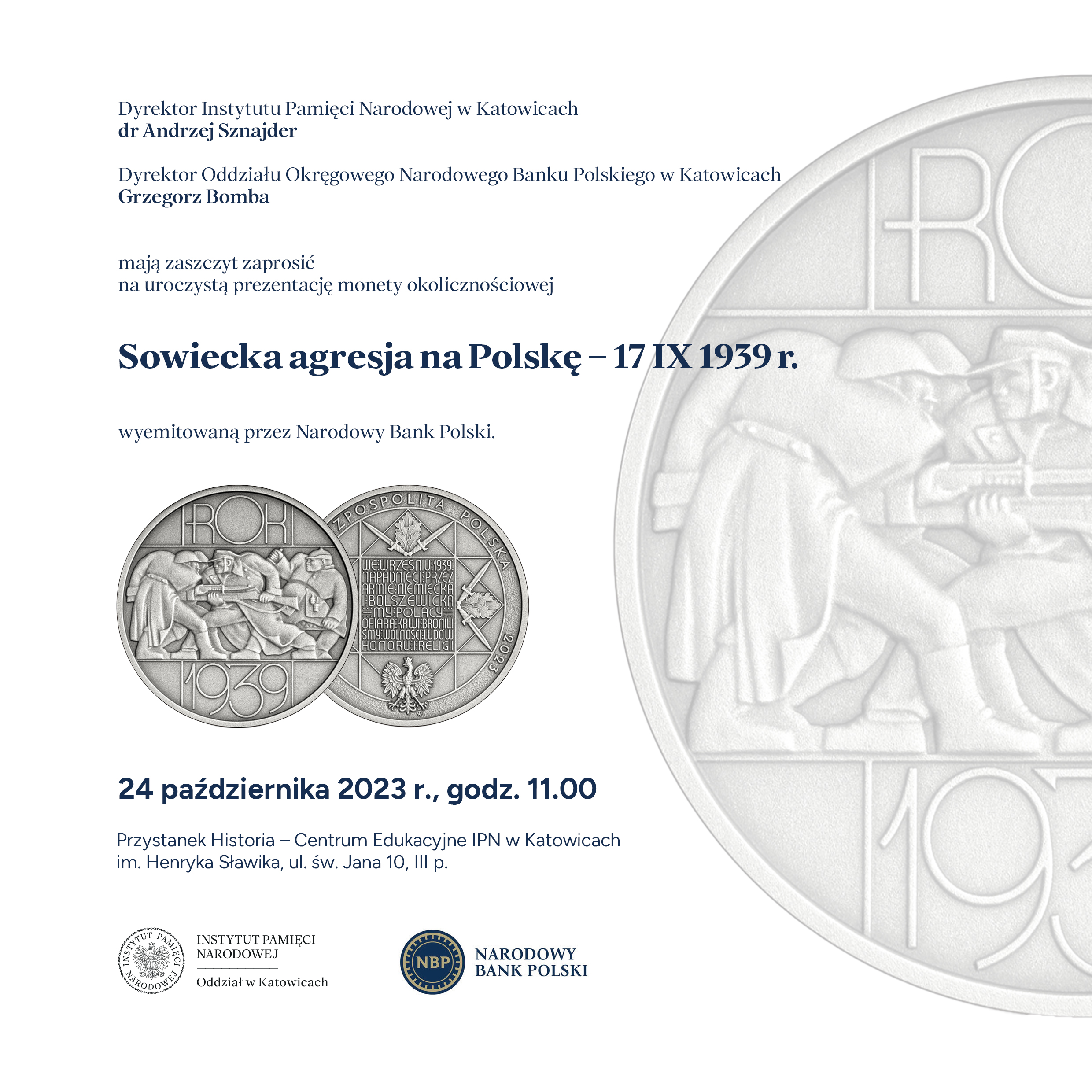 We wtorek 24 października 2023 r., w Przystanku Historia – Centrum Edukacyjnym IPN w Katowicach im. Henryka Sławika, przy ul. św. Jana 10, odbyła się prezentacja monety okolicznościowej „Sowiecka agresja na Polskę – 17 IX 1939 r.”. Wydarzenie zostało zorganizowane przez Oddział IPN w Katowicach oraz Oddział Okręgowego Narodowego Banku Polskiego w Katowicach.