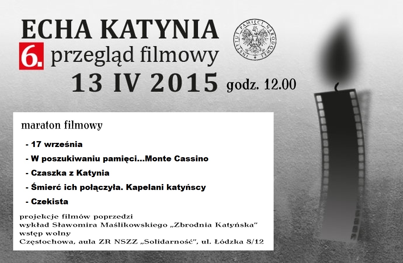 Przegląd Filmów „Echa Katynia” w Częstochowie – 13 kwietnia 2015, (miejsce: aula Zarządu Częstochowskiego NSZZ „Solidarność”, ul. Łódzka 8/12)
