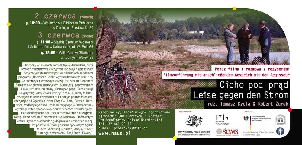 3 czerwca 2015, o godz. 11.00, w Śląskim Centrum Wolności i Solidarności w Katowicach (ul. W. Pola 65) odbędzie się prezentacja filmu „Cicho pod prąd / Leise gegen den Strom” oraz spotkanie z autorami filmu – Tomaszem Kycią i dr. hab. Robertem Żurkiem. W spotkaniu weźmie udział Andrzej Sznajder, dyrektor Oddziału IPN w Katowicach.