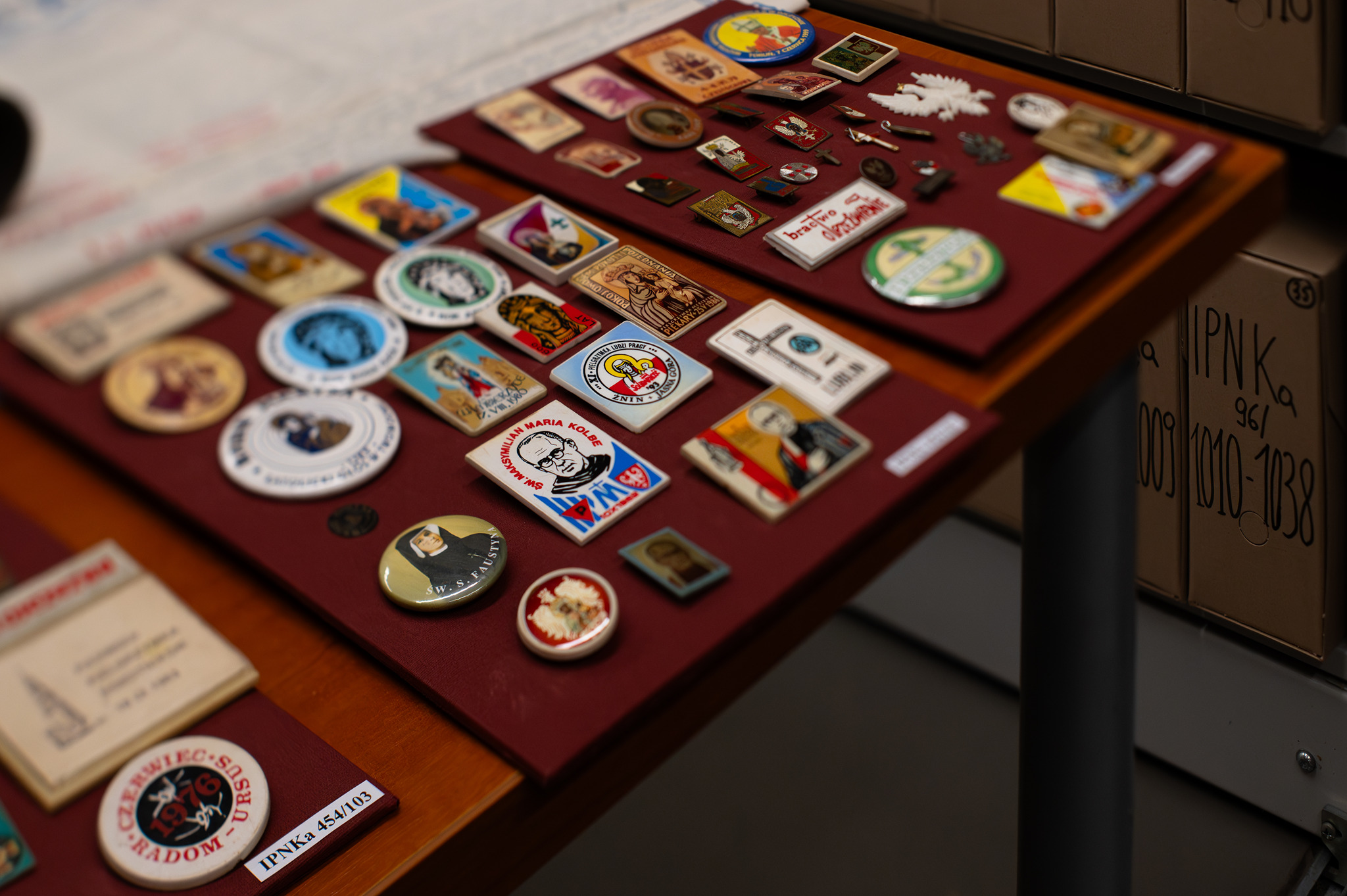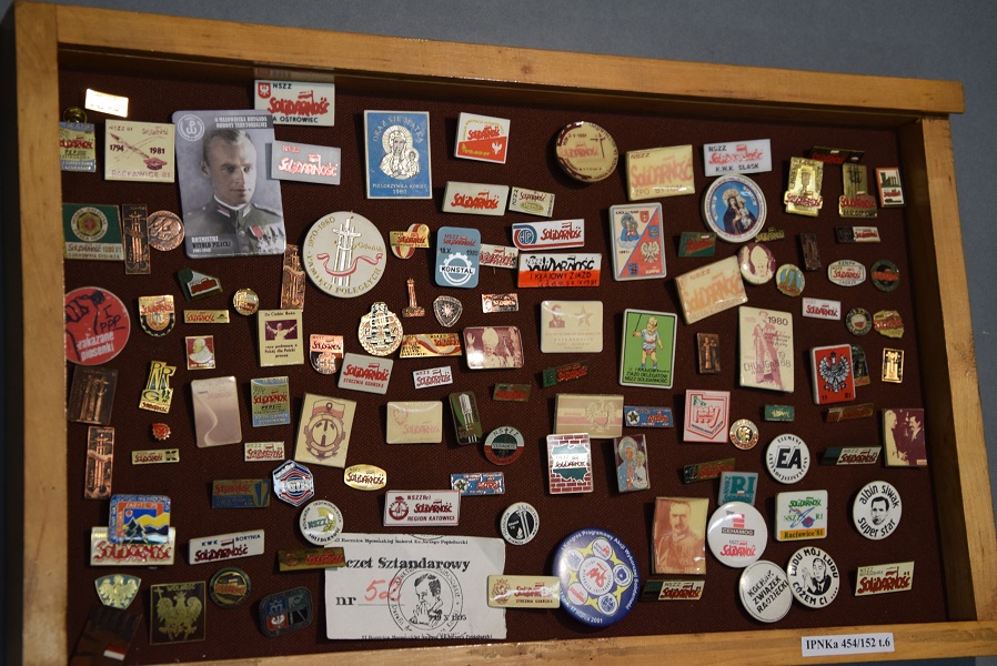 Zbiór przypinek, znaczków, m.in. z symboliką NSZZ „Solidarność”.