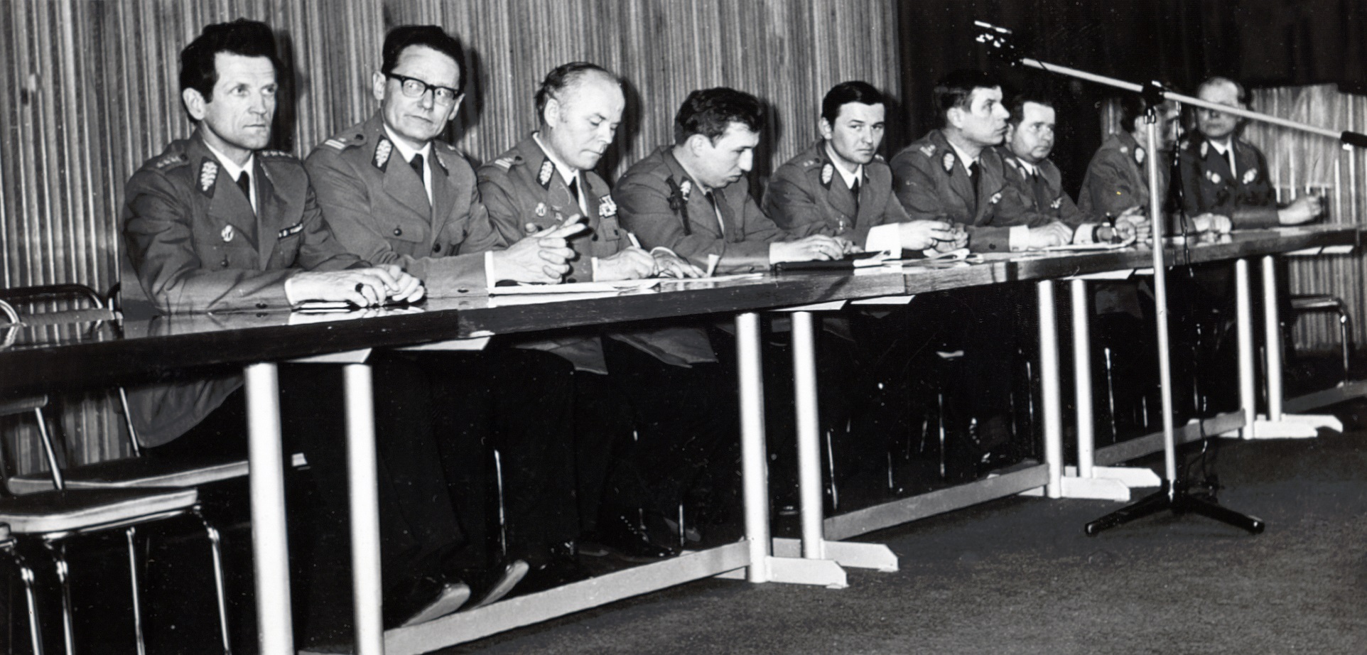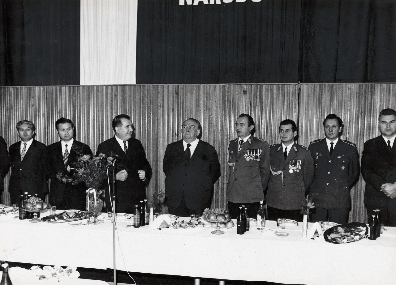 Spotkanie „aktywu partyjno-politycznego” regionu z funkcjonariuszami KW MO Katowice, październik 1972 r. W środku widzimy Jerzego Ziętka (przewodniczący prezydium WRN), trzeci od lewej – Zdzisław Grudzień (I Sekretarz KW PZPR) -