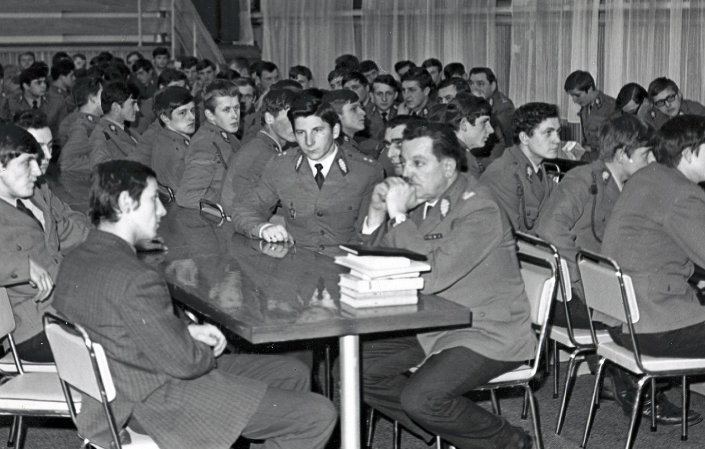Spotkanie Egzekutywy POP z aktywem ZMS ZOMO w Katowicach. 45 osób odebrało legitymacje członkowskie, a kilka odznaki „Młodzież dla postępu” i „Honorową odznakę TKKF” (Towarzystwo Krzewienia Kultury Fizycznej), 7 marca 1975 r. -