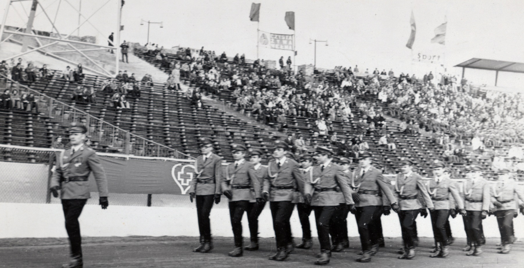 Apel pododdziałów ZOMO w rocznicę zakończenia II wojny światowej, obchodzoną wówczas w Polsce 9 maja, 1975 r. -