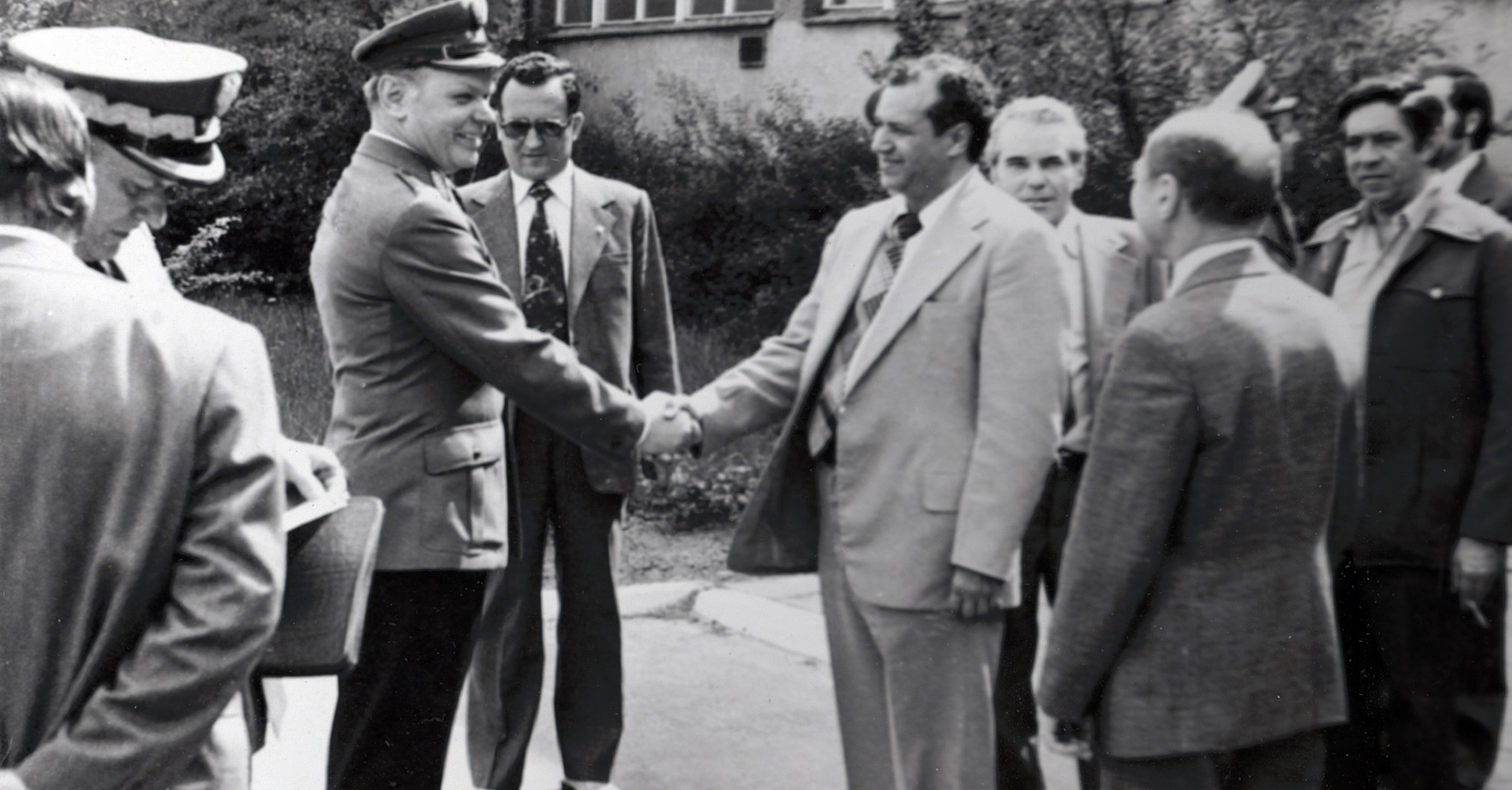 Wizyta ministra spraw wewnętrznych Kuby Sergio del Valle Jimeneza w jednostce. Z gościem wita się komendant wojewódzki MO w Katowicach, Benedykt Cader, 15 maja 1979 r. -