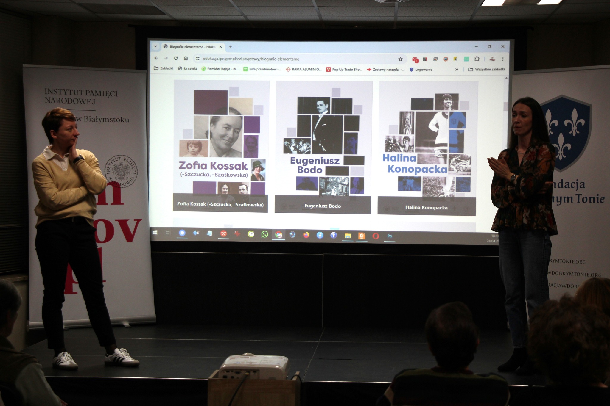 Dr Angelika Blinda i Ewelina Małachowska z Oddziałowego Biura Edukacji Narodowej IPN w Katowicach miały okazje przekazać mieszkańcom województwa podlaskiego fascynującą historię wybitnej polskiej pisarki, pomysłodawczyni i liderki Rady Pomocy Żydom „Żegota”. Prelekcje poprzedzały pokazy filmu dokumentalnego „Mulier fortis. Kobieta mężna” poświęconego życiu Zofii Kossak-Szczuckiej.