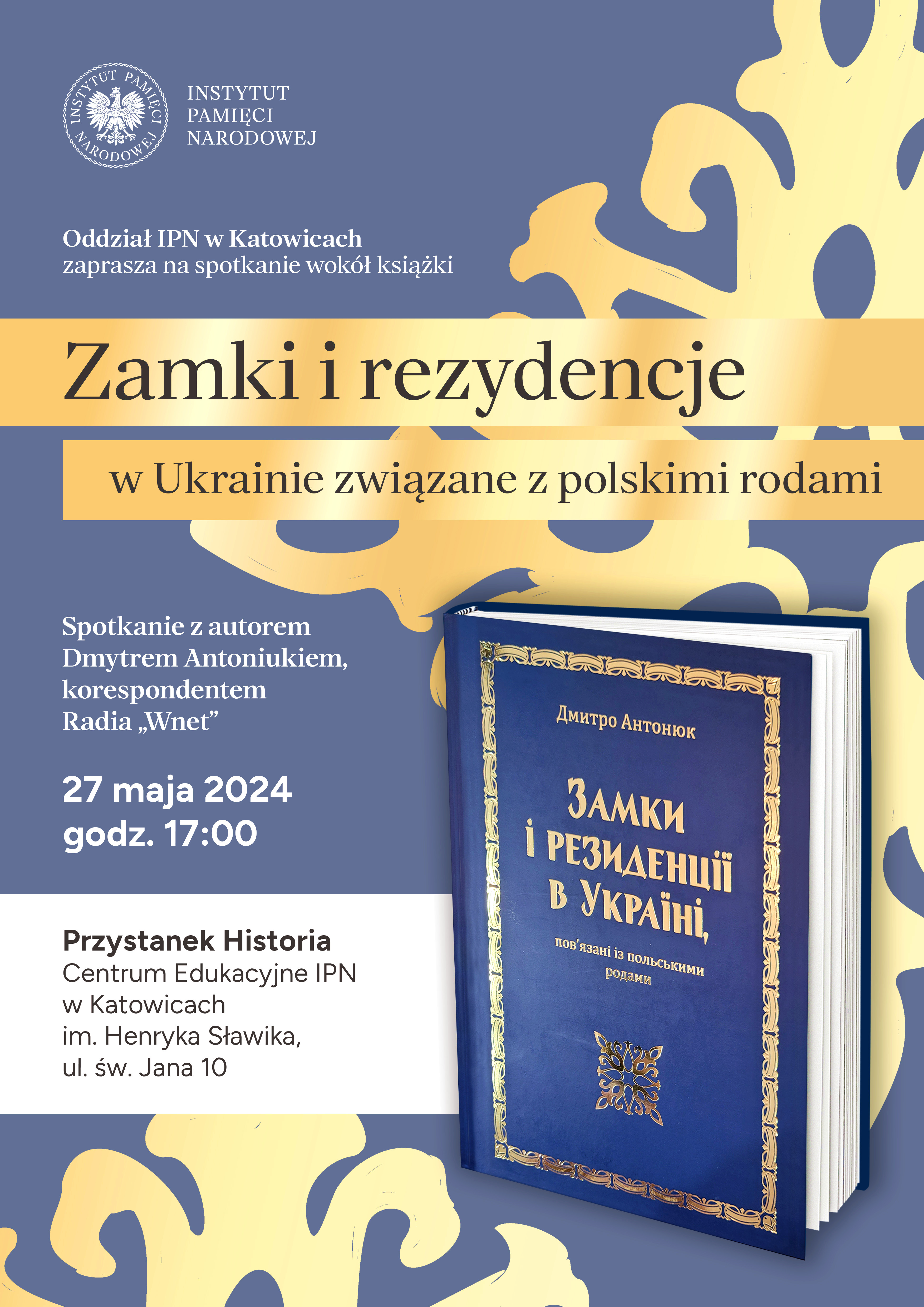 W Przystanku Historia – Centrum Edukacyjnym IPN w Katowicach 27 maja odbyło się spotkanie autorskie z Dmytro Antoniukiem, poświęcone jego najnowszej książce pt. „Zamki i rezydencje na Ukrainie związane z Polską”. Ukraiński dziennikarz, publicysta, podróżnik i przewodnik jest autorem wielu publikacji poświęconych dziedzictwu kulturowemu Ukrainy, które odnosi się do wspólnego dziedzictwa przedrozbiorowej Rzeczpospolitej.