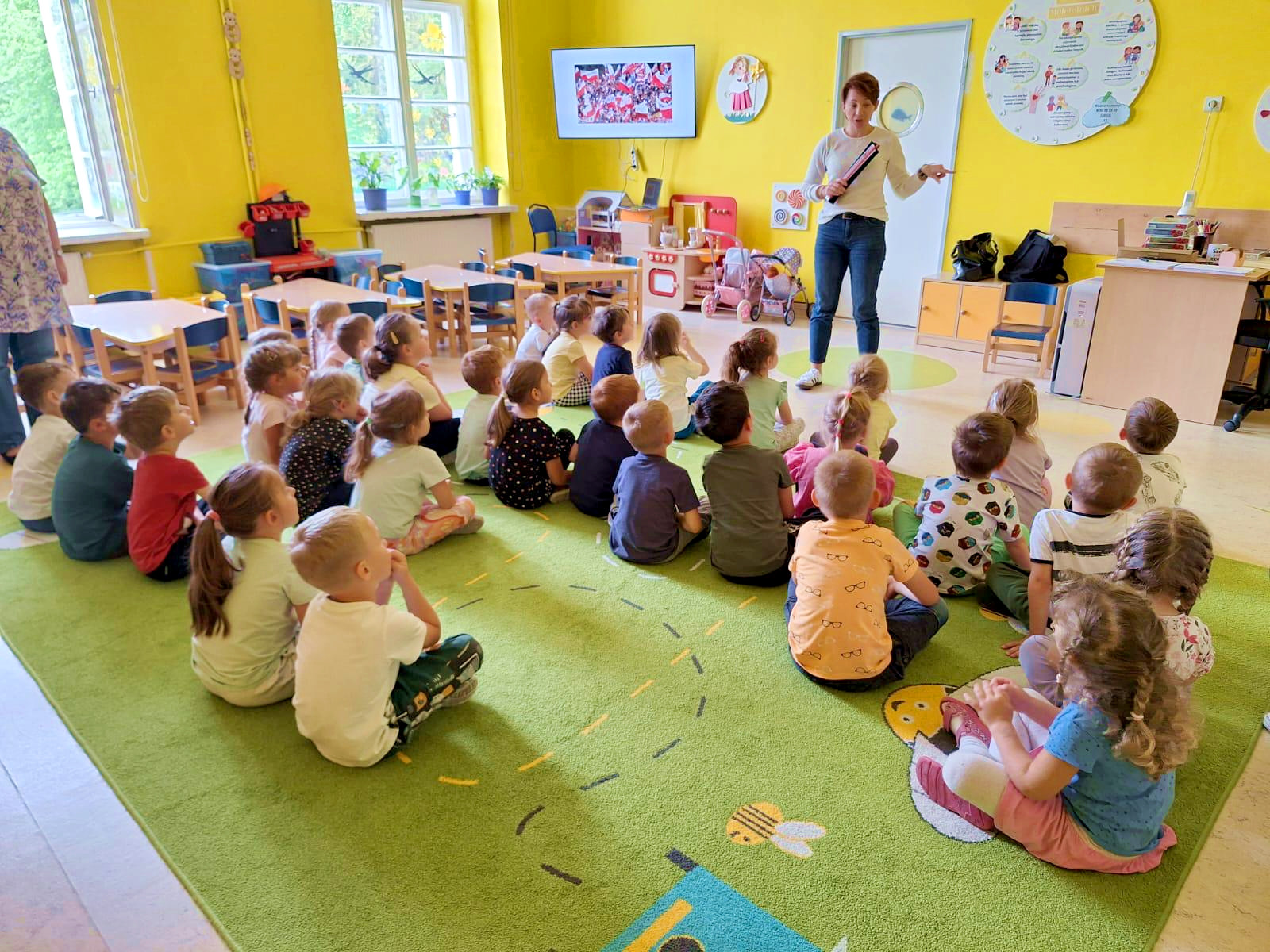 Dzieci z grup "Groszki", "Pszczółki", "Rybki", "Kasztanki", "Kreciki" i "Motylki" zobaczyły film "Polak Mały" oraz dowiedziały się m.in. skąd wziął się biały orzeł w naszym herbie narodowym, czym różni się polska flaga od bandery, gdzie można zobaczyć polską szachownicę i jaka jest właściwa postawa kiedy odśpiewywany jest hymn narodowy.