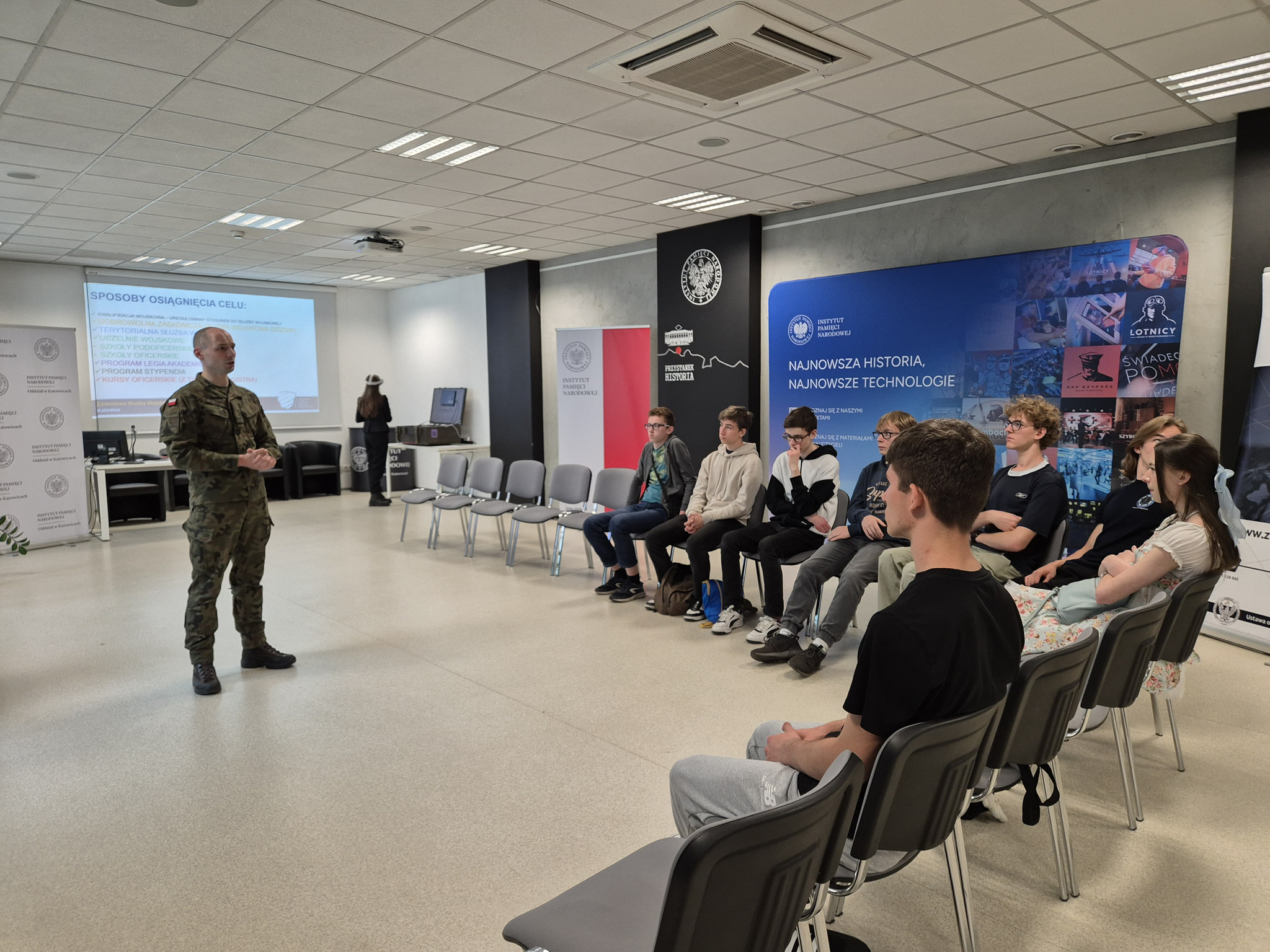 Uczniowie, oprócz zapoznania się z najnowszym projektem gamingowym IPN, uczestniczyli także w spotkaniu z przedstawicielem Wojskowego Centrum Rekrutacji w Katowicach, który opowiedział o perspektywach i szansach związanych z zawodową służbą wojskową.