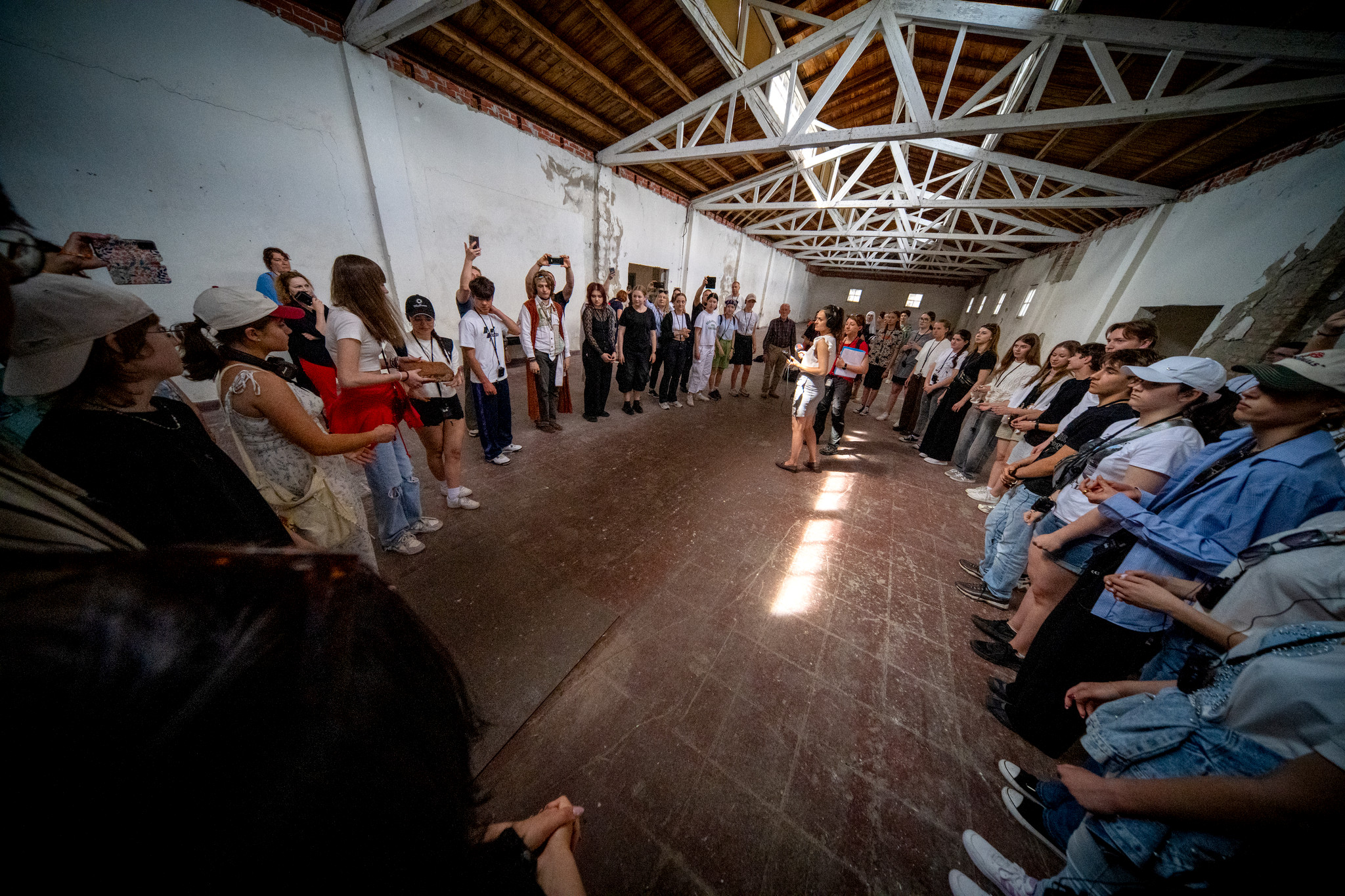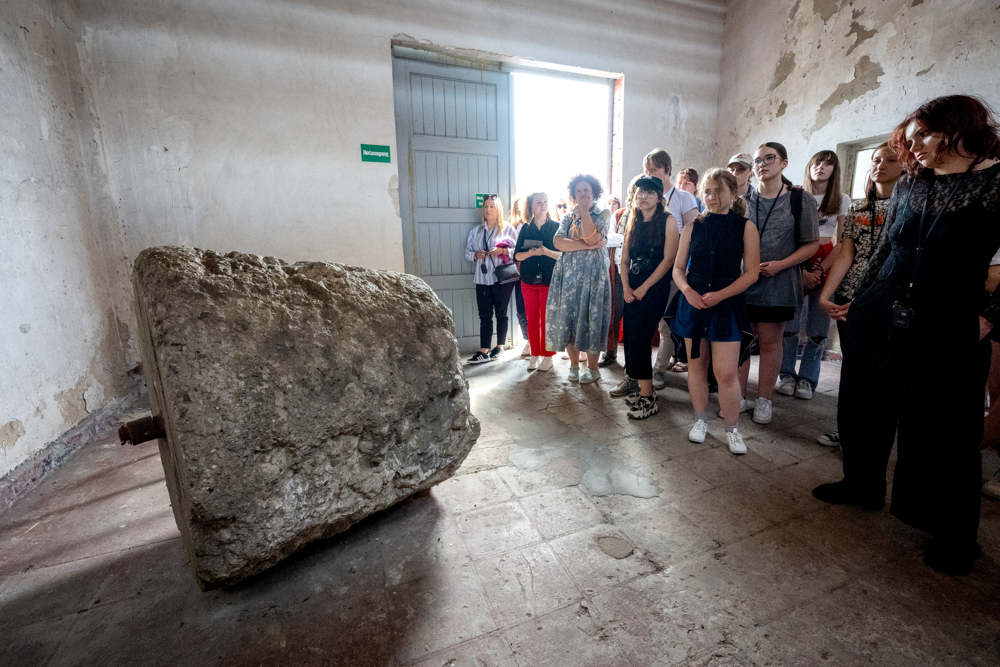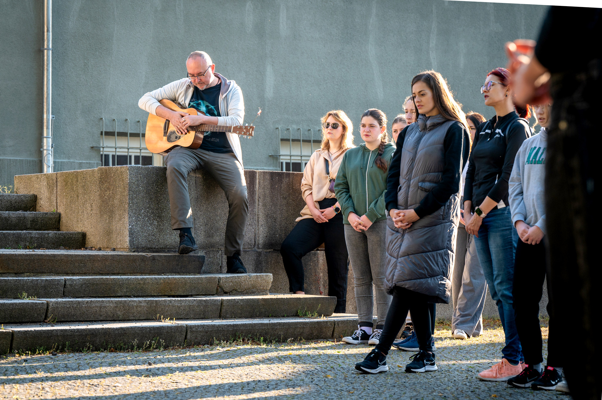 W drugiej części dnia grupa przemaszerowała przez obozową bramę, ulicą Lagrową wzdłuż nieistniejących już dzisiaj baraków więźniarek. W miejscu, gdzie znajdowała się obozowa kuchnia zebrani wysłuchali opowieści o głodzie panującym w obozie. W miejscu dawnego rewiru czyli szpitala mówiliśmy o eksperymentach medycznych i operacjach doświadczalnych wykonywanych na więźniarkach. Tam, gdzie znajdował się blok karny młodzieży zobaczyła jak wyglądała okrutna rzeczywistość w tym miejscu. Grupa spędziła także czas w budynku dawnych szwalni, gdzie więźniarki w dzień i w nocy zajmowały się szyciem mundurów dla niemieckich żołnierzy. Tu Michał Neumann, syn więźniarki Marii Hiszpańskiej-Neumann opowiedział o swojej mamie i przeprowadził z uczestnikami wyjazdu małe doświadczenie: ustawieni w kole młodzi ludzie i ich opiekunowie mieli za zadanie w szybkim tempie przekazywać sobie z rąk do rąk ciężkie cegły. W ten sposób przynajmniej w minimalnym stopniu młodzież mogła doświadczyć ciężkiej pracy wykonywanej przez więźniarki każdego dnia.