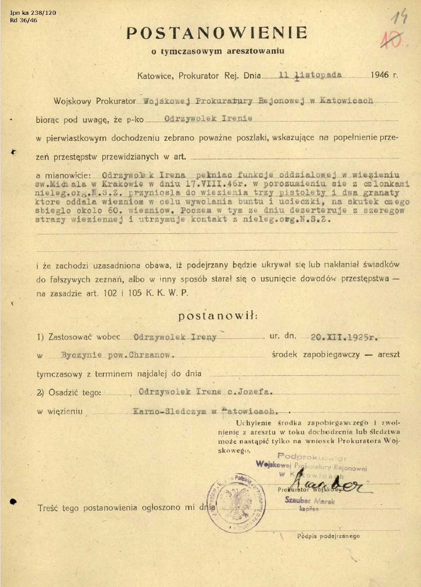 Postanowienie o tymczasowym aresztowaniu Ireny Odrzywołek, 11 XI 1946 r. (IPN Ka 238/120) -