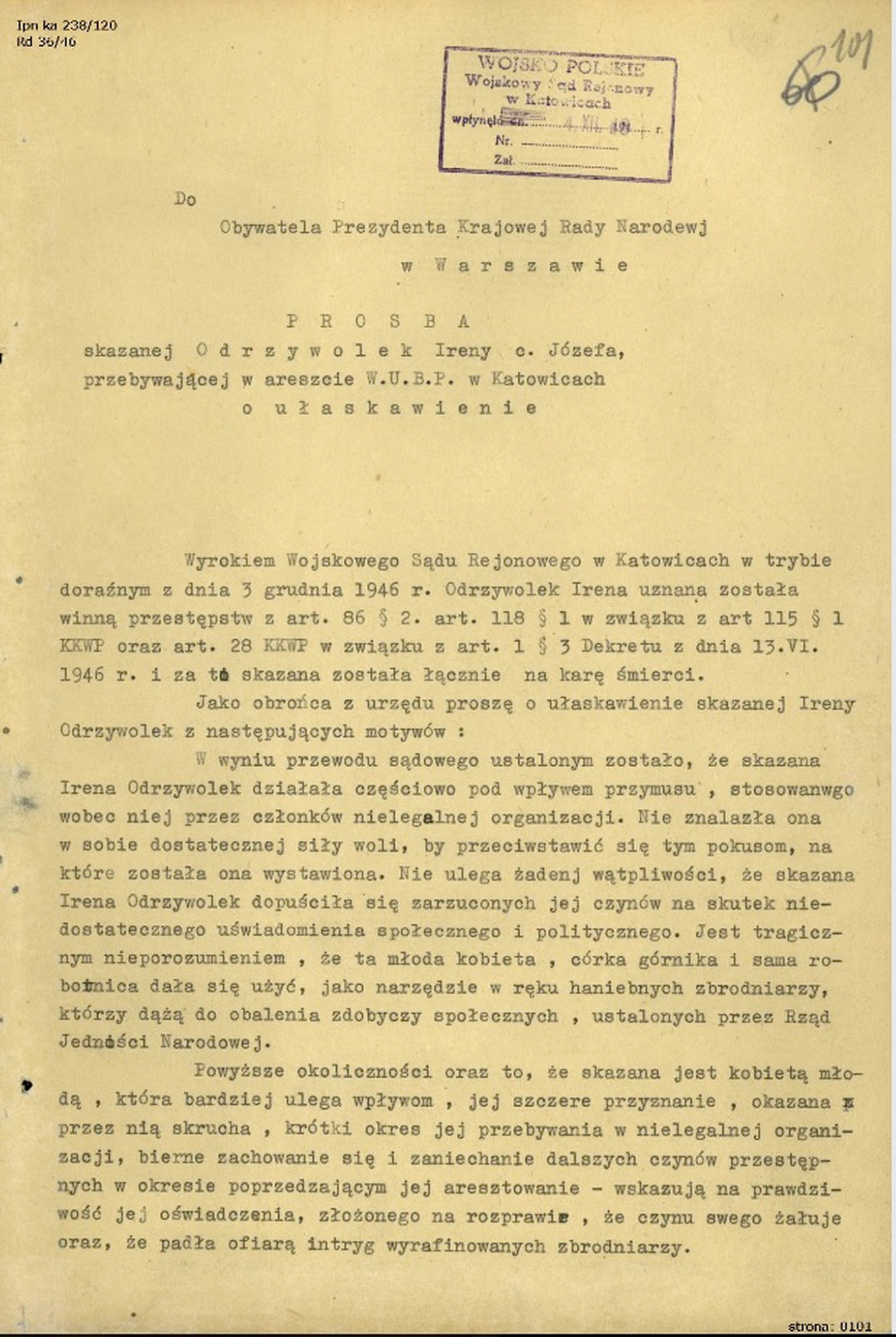Prośba obrońcy Ireny Odrzywołek o ułaskawienie, 4 XII 1946 r. (IPN Ka 238/120) -