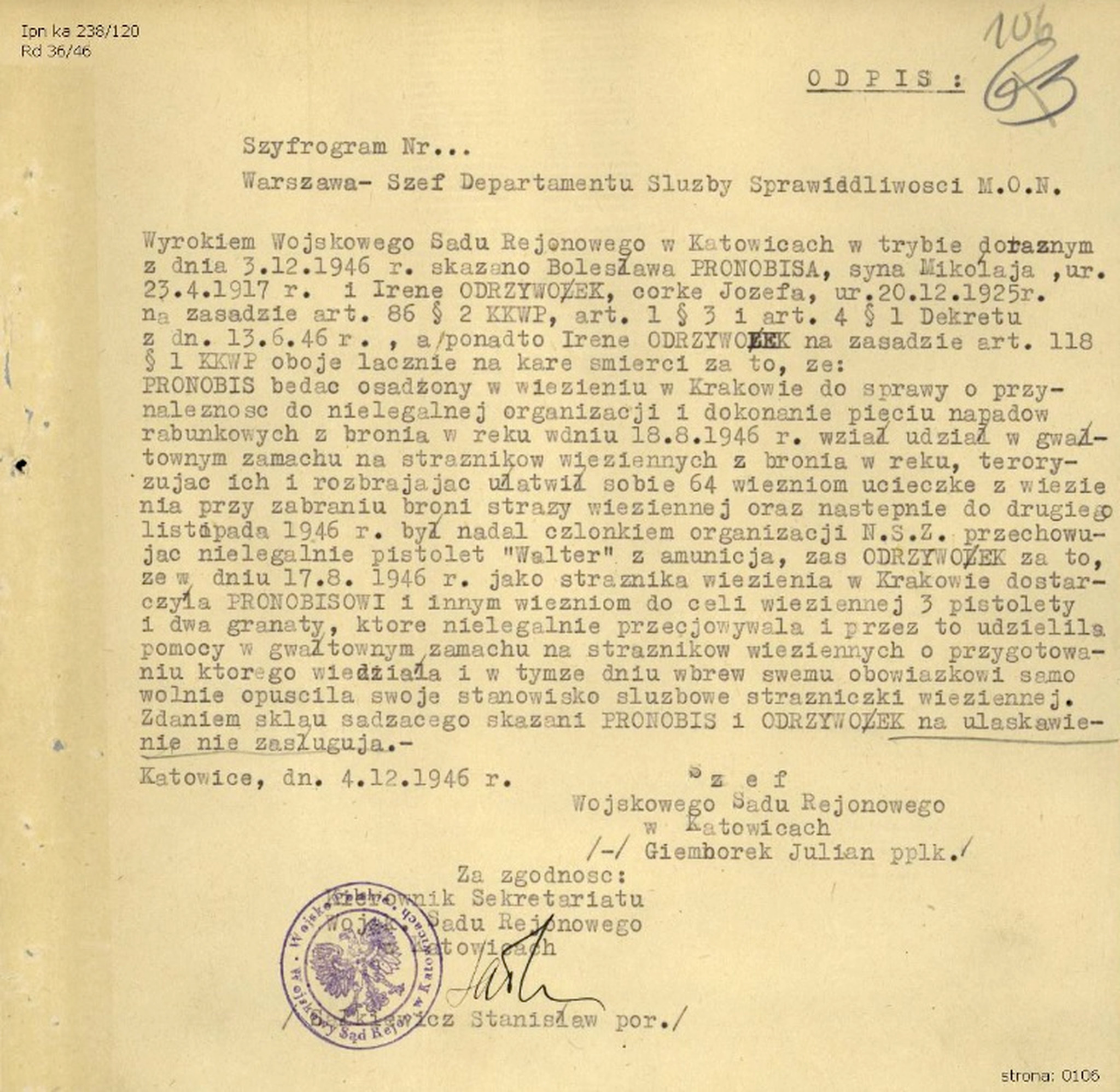 Opinia ppłk. Juliana Giemborka, szefa WSR w Katowicach, w sprawie ułaskawienia Ireny Odrzywołek i Bolesława Pronobisa, 4 XII 1946 r. (IPN Ka 238/120) -