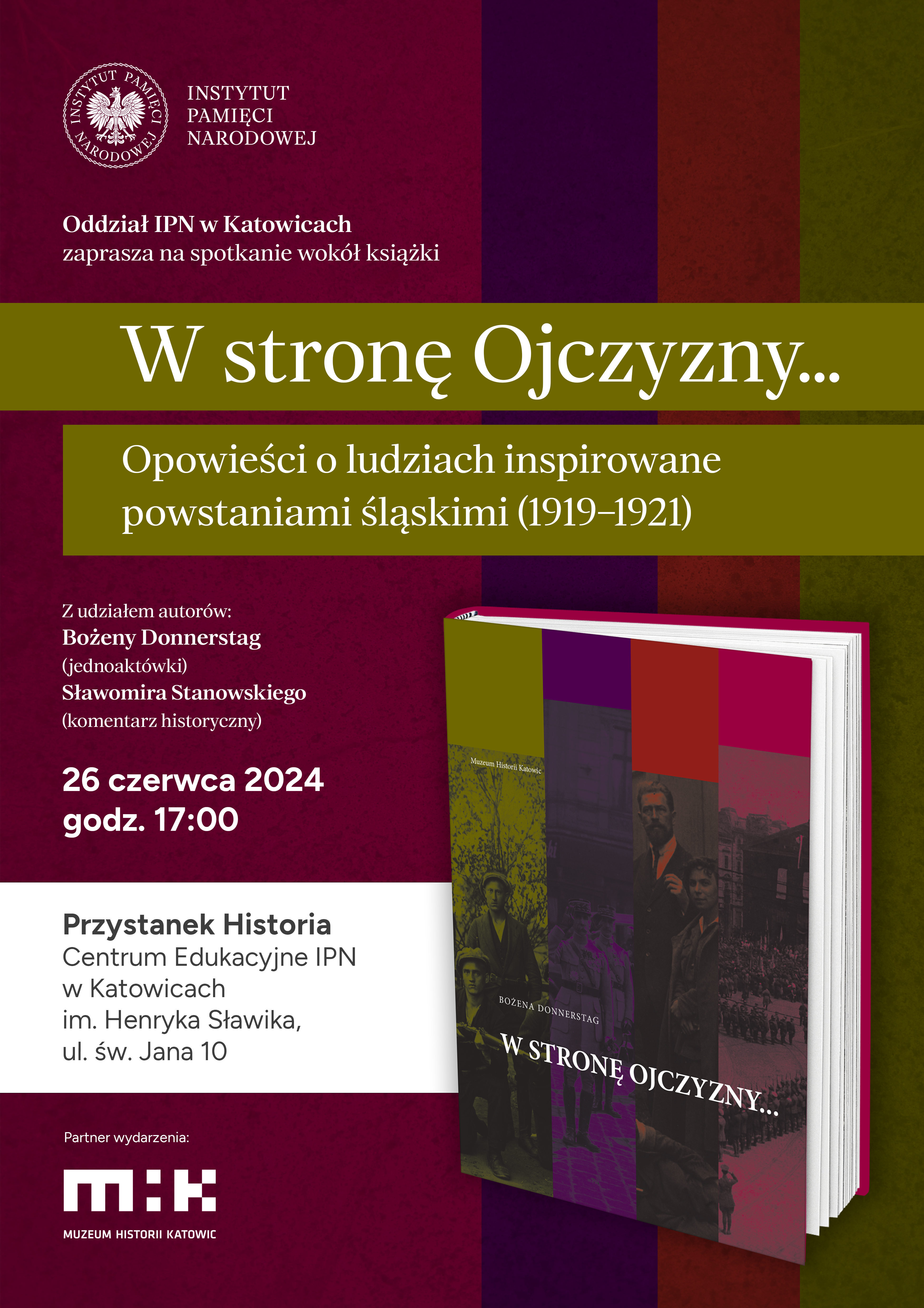 26 czerwca 2024 r. w Przystanku Historia Centrum Edukacyjne IPN w Katowicach im. Henryka Sławika, odbyło się wyjątkowe spotkanie poświęcone książce Bożeny Donnerstag "W stronę ojczyzny. Opowieści o ludziach inspirowane powstaniami śląskimi (1919-1921)" z komentarzem historycznym Sławomira Stanowskiego.