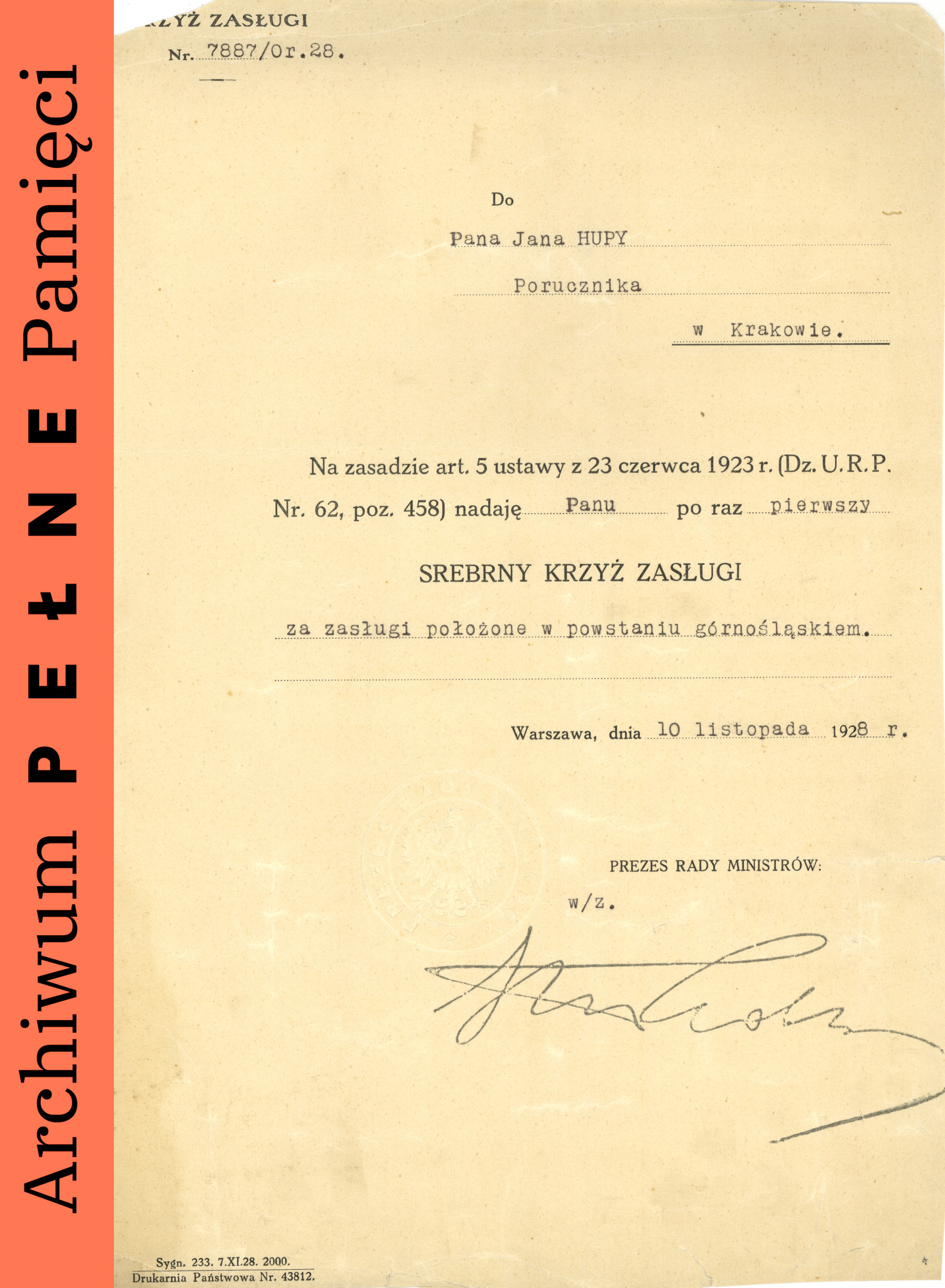 Akt nadania Janowi Hupie Srebrnego Krzyża Zasługi za „Zasługi położone w powstaniu górnośląskim”, Warszawa 10 XI 1928 r., IPN Ka 454/193, t. 1 -