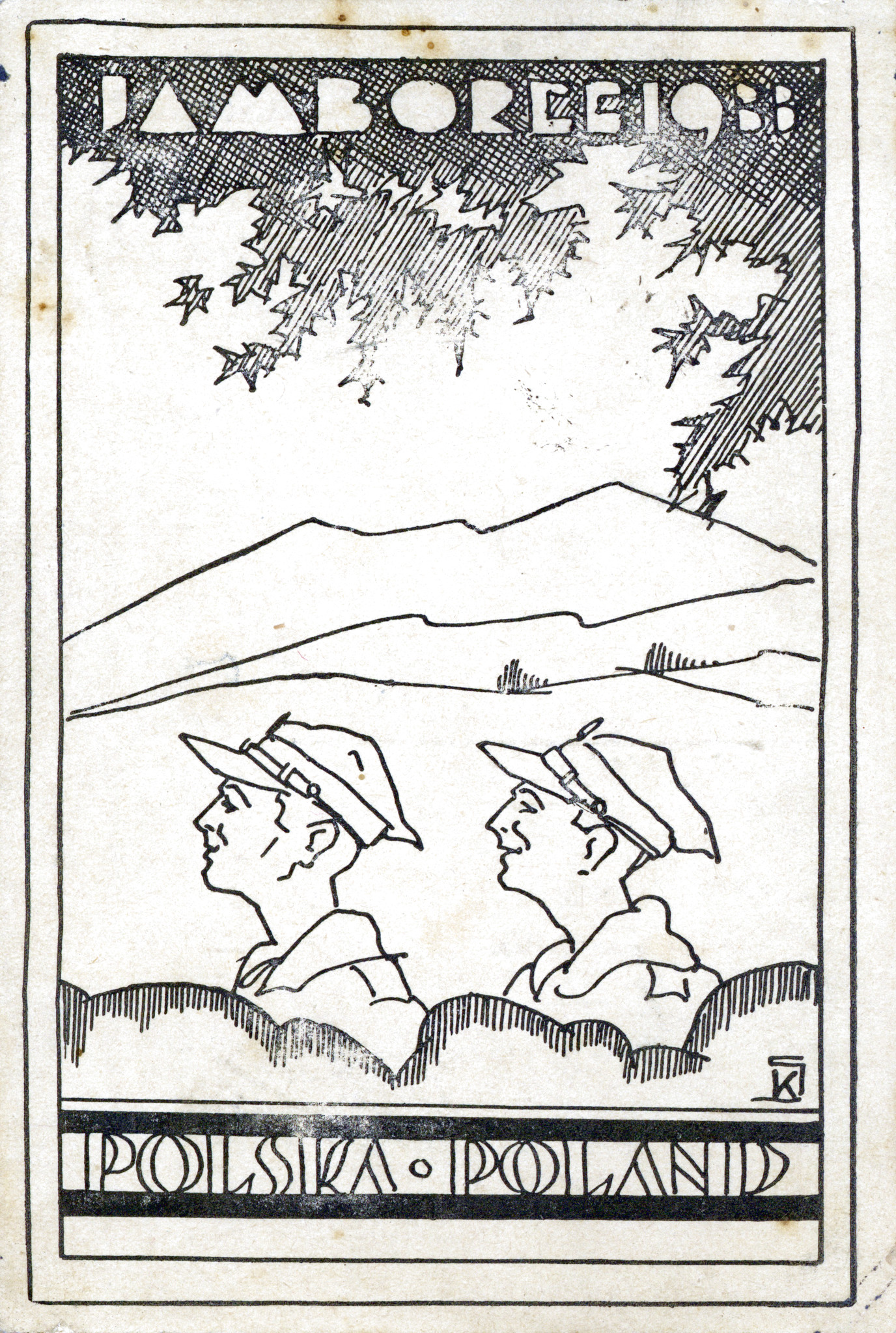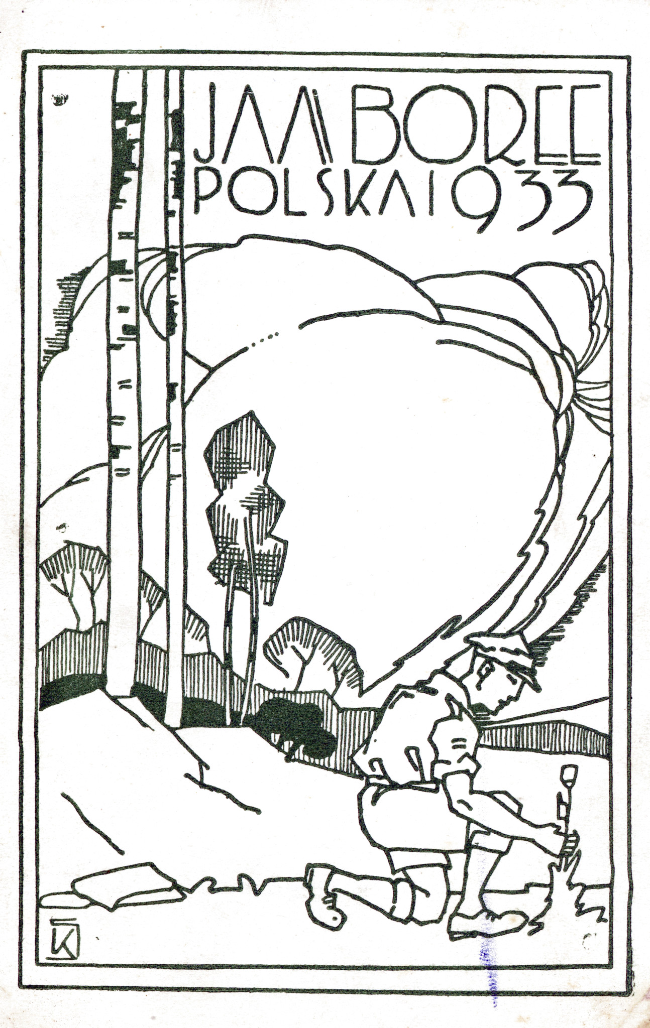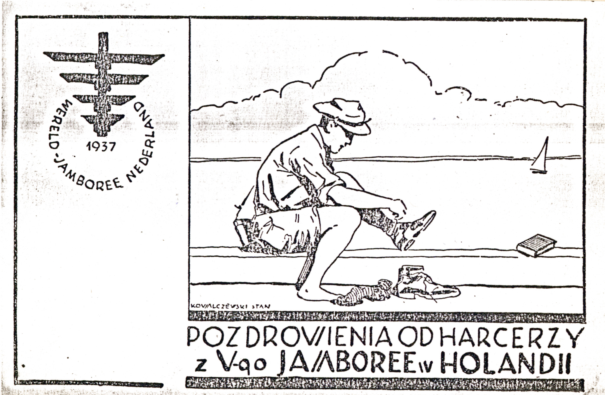 Pocztówka wydana przez 1 ZDH podczas V Jamboree Skautowego w Holandii, 1937 r., możliwy autor: Stan Kowalczewski (IPN Ka 454/194, t. 2)
