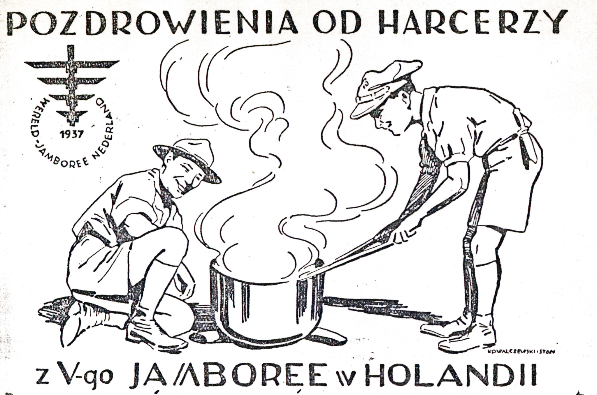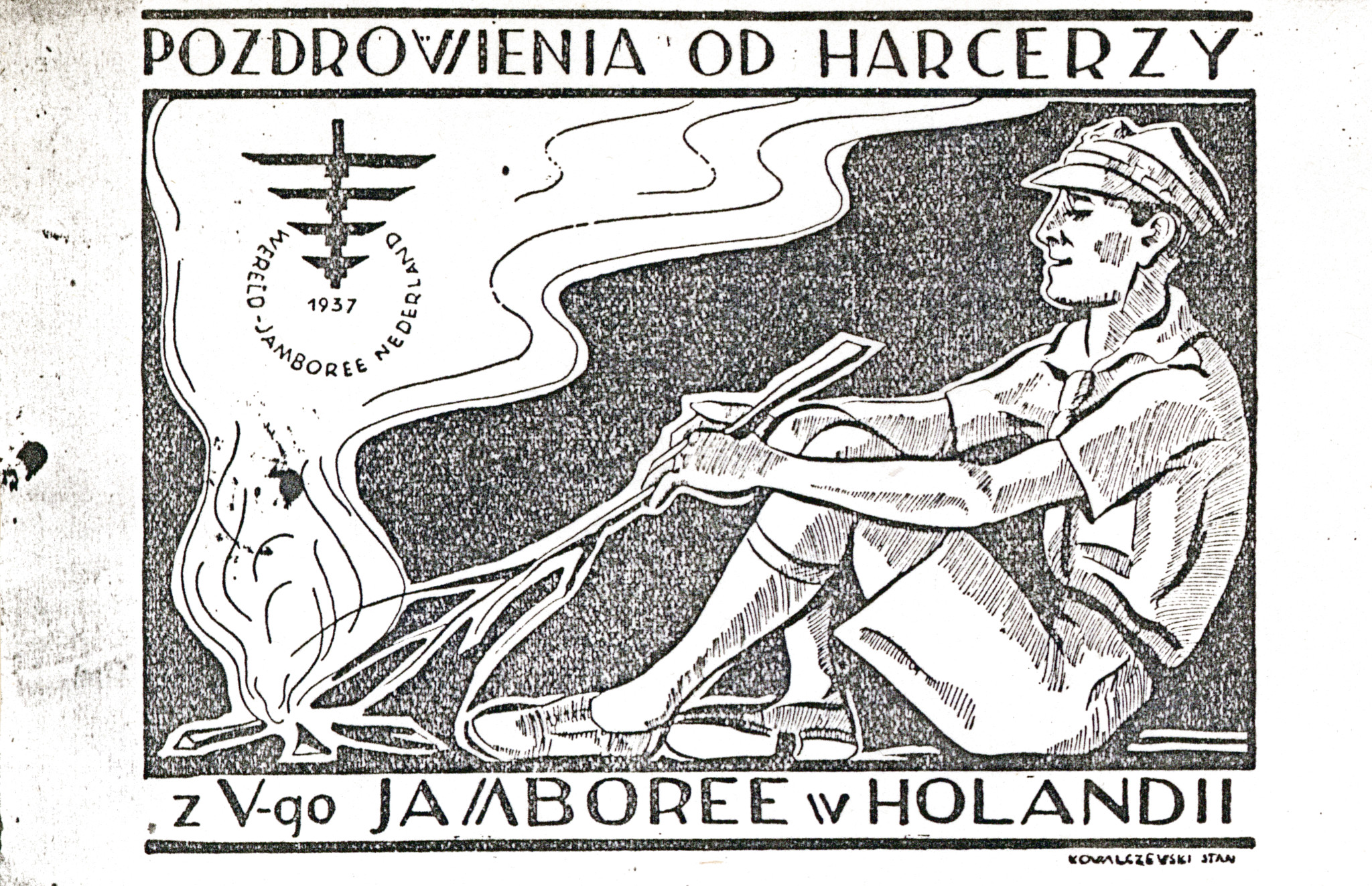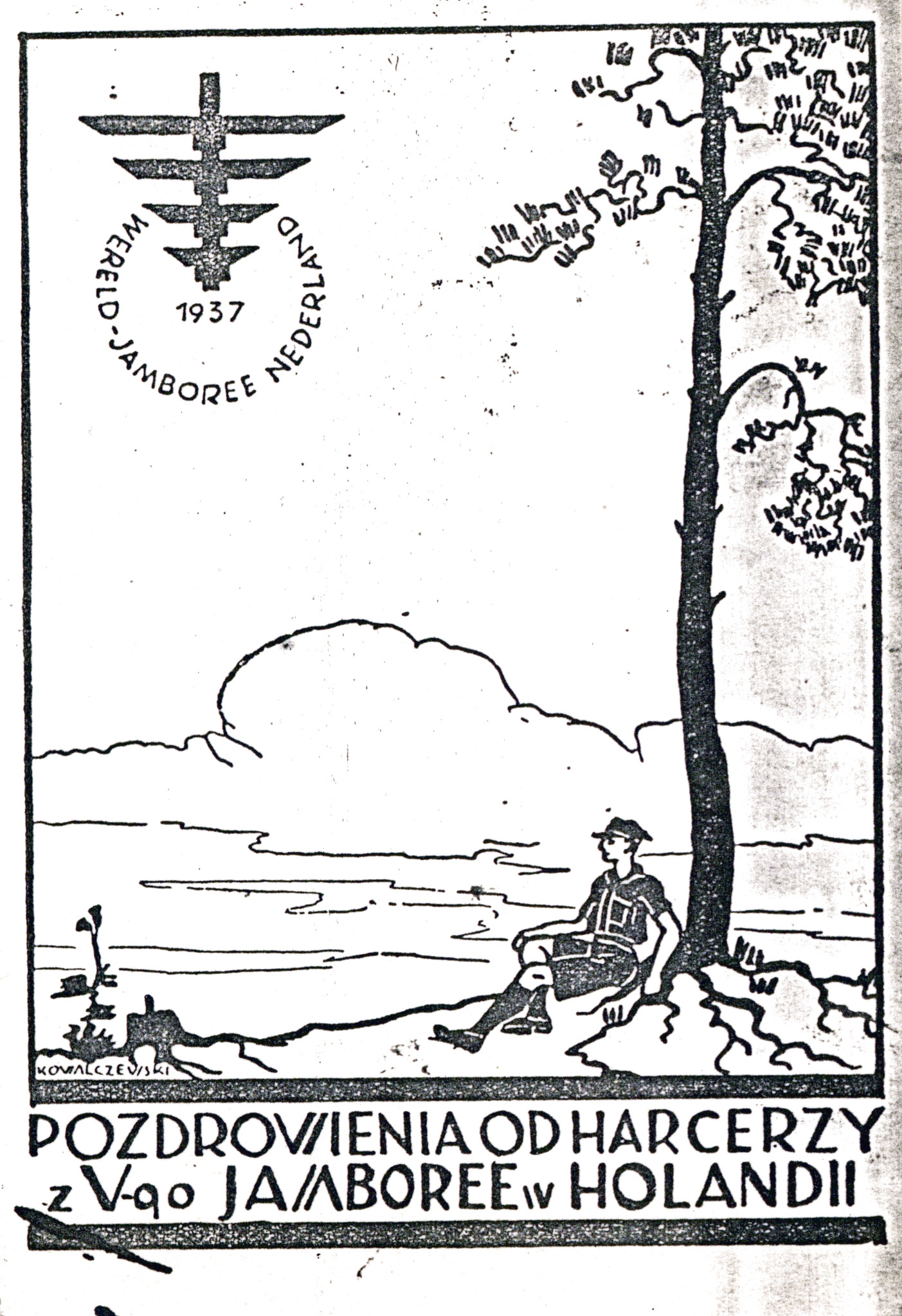 Pocztówka wydana przez 1 ZDH podczas V Jamboree Skautowego w Holandii, 1937 r., możliwy autor: Stan Kowalczewski (IPN Ka 454/194, t. 2) -